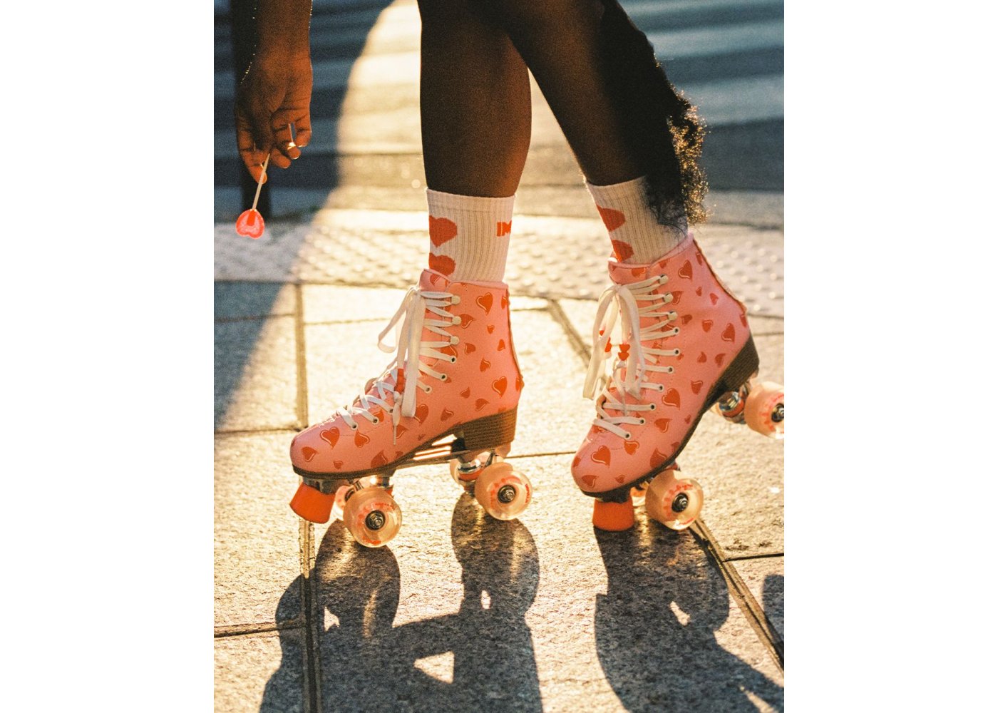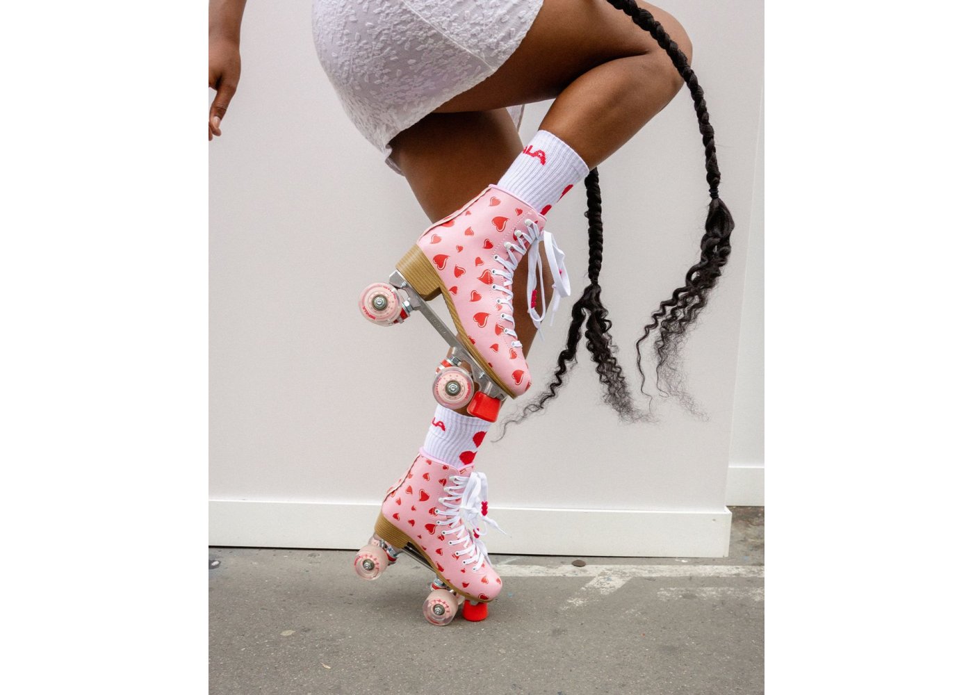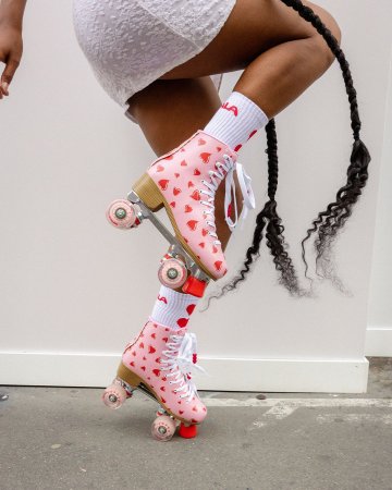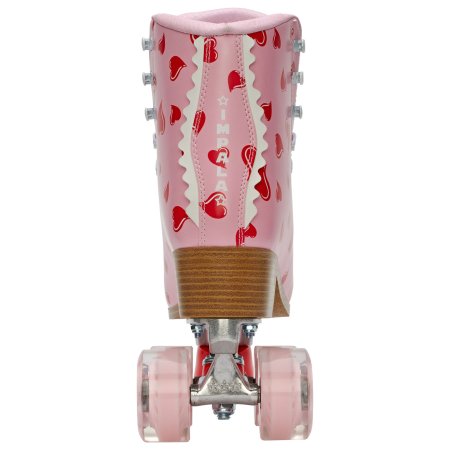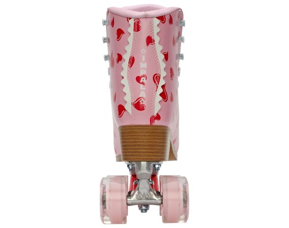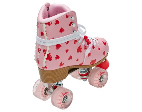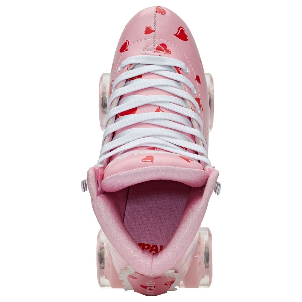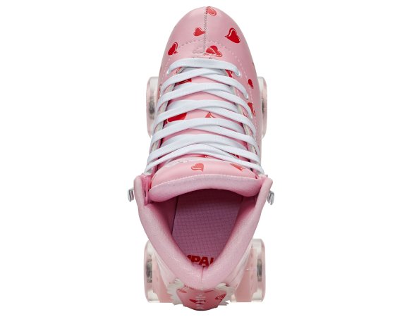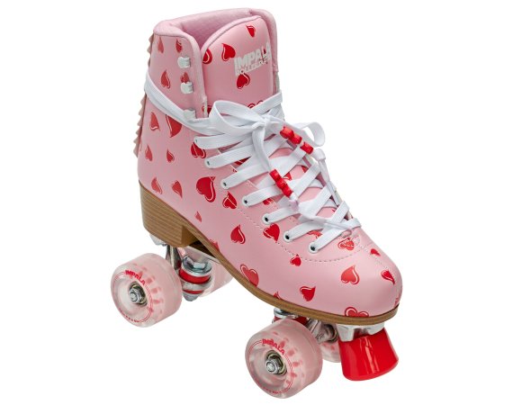 Super seje Side-by-side rulleskøjter i rosa med røde hjerter i forskellige størrelser fra Impala.