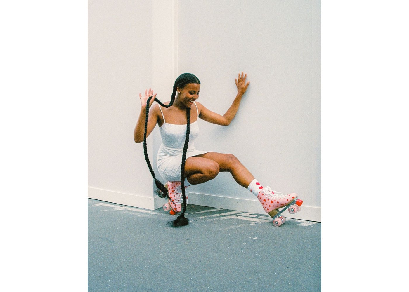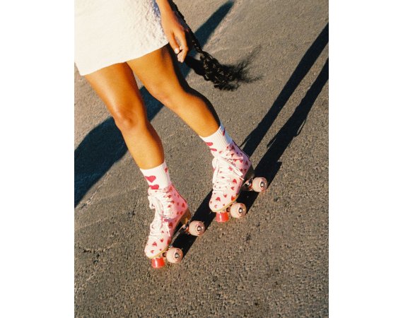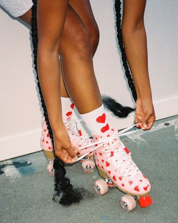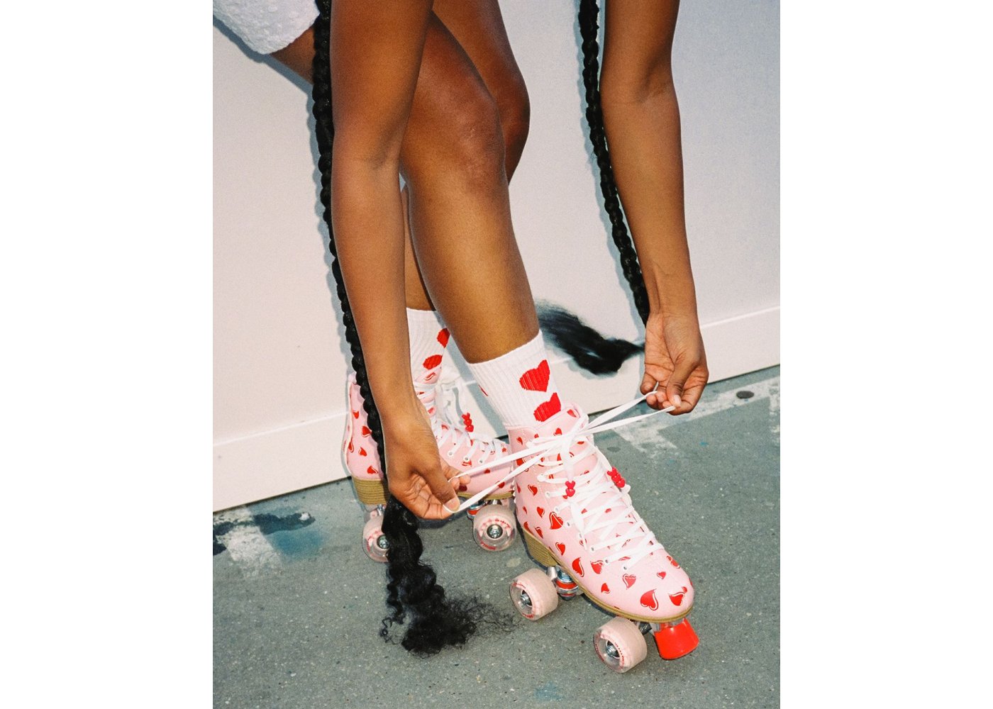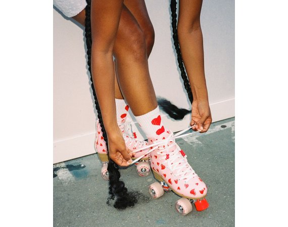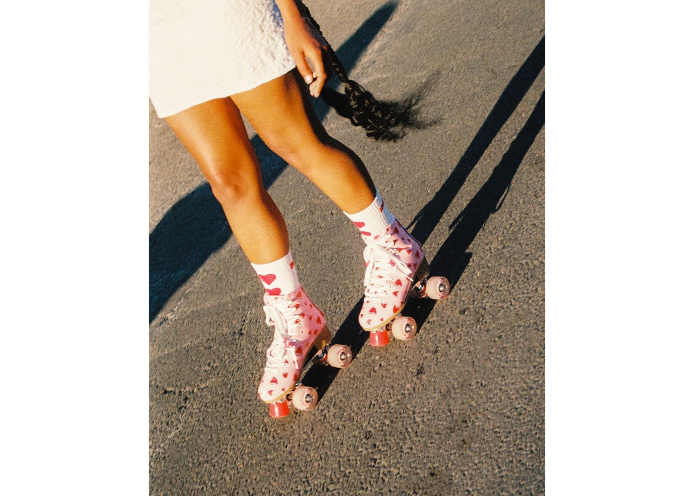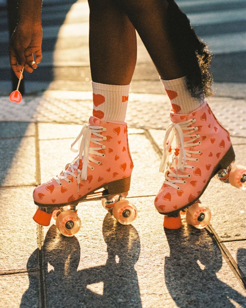 Super seje Side-by-side rulleskøjter i rosa med røde hjerter i forskellige størrelser fra Impala.