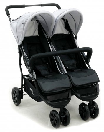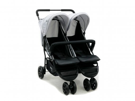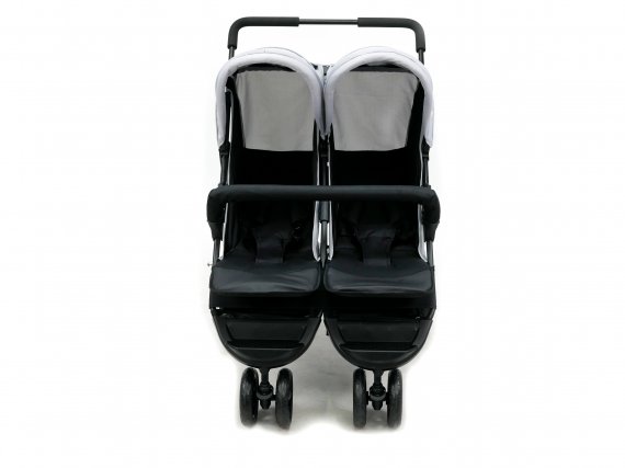 Fin tvilling klapvogn med stel af stål og en dejlig bred kaleche i kontrastfarve.