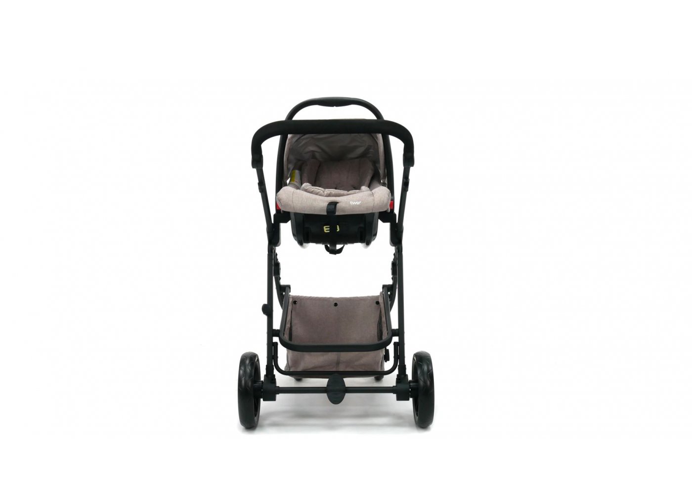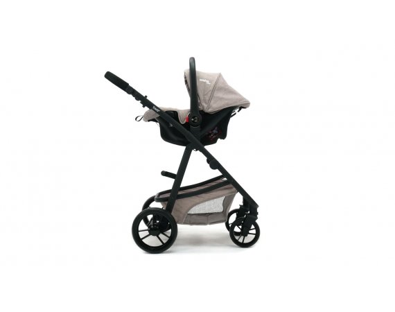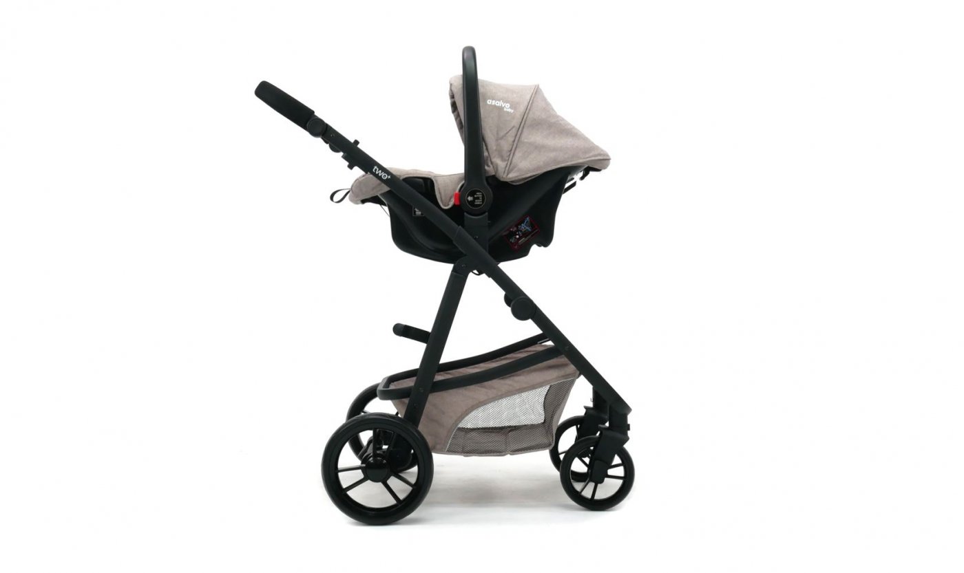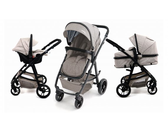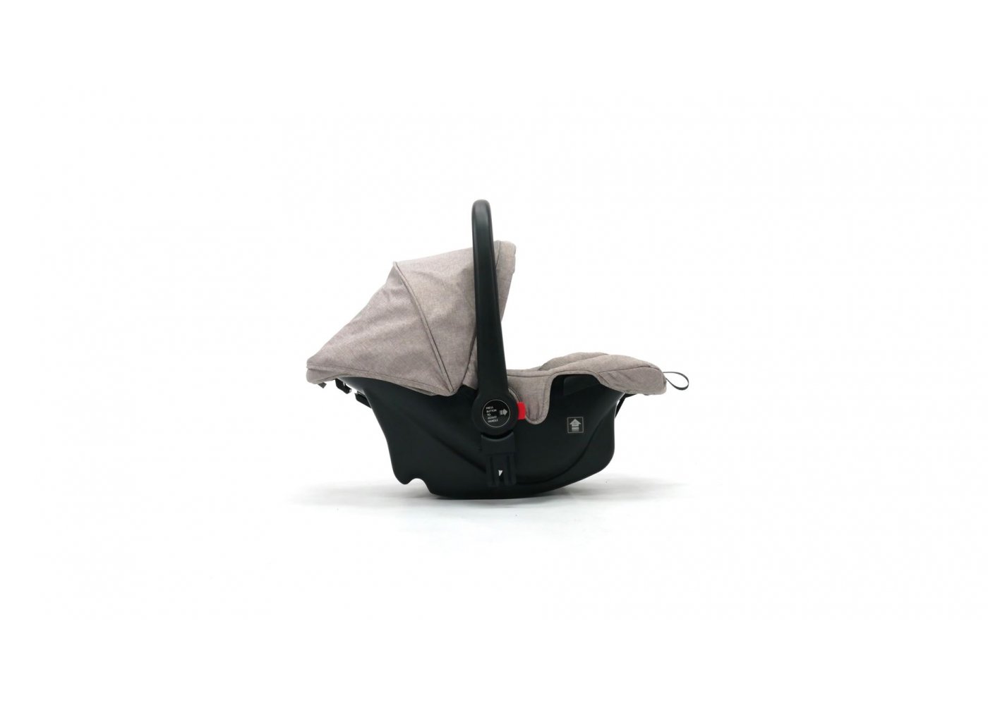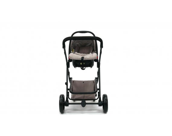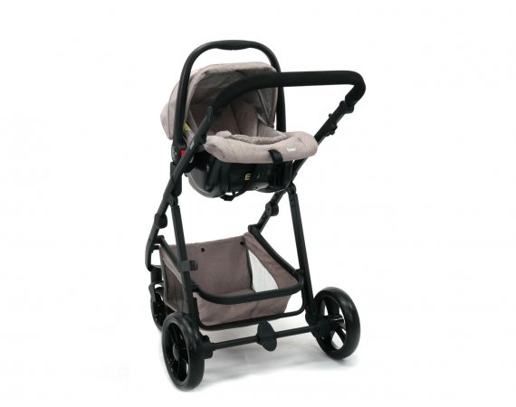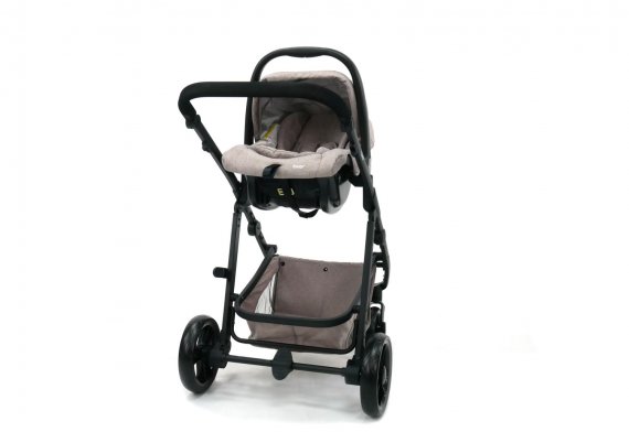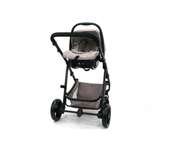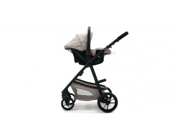 Skønt barneudstyrssæt bestående af en autostol Gruppe 0 (0 - 13 kg.), et aluminiumsstel og et klapvognssæde der omdannes til barnevognslift i ét trin.