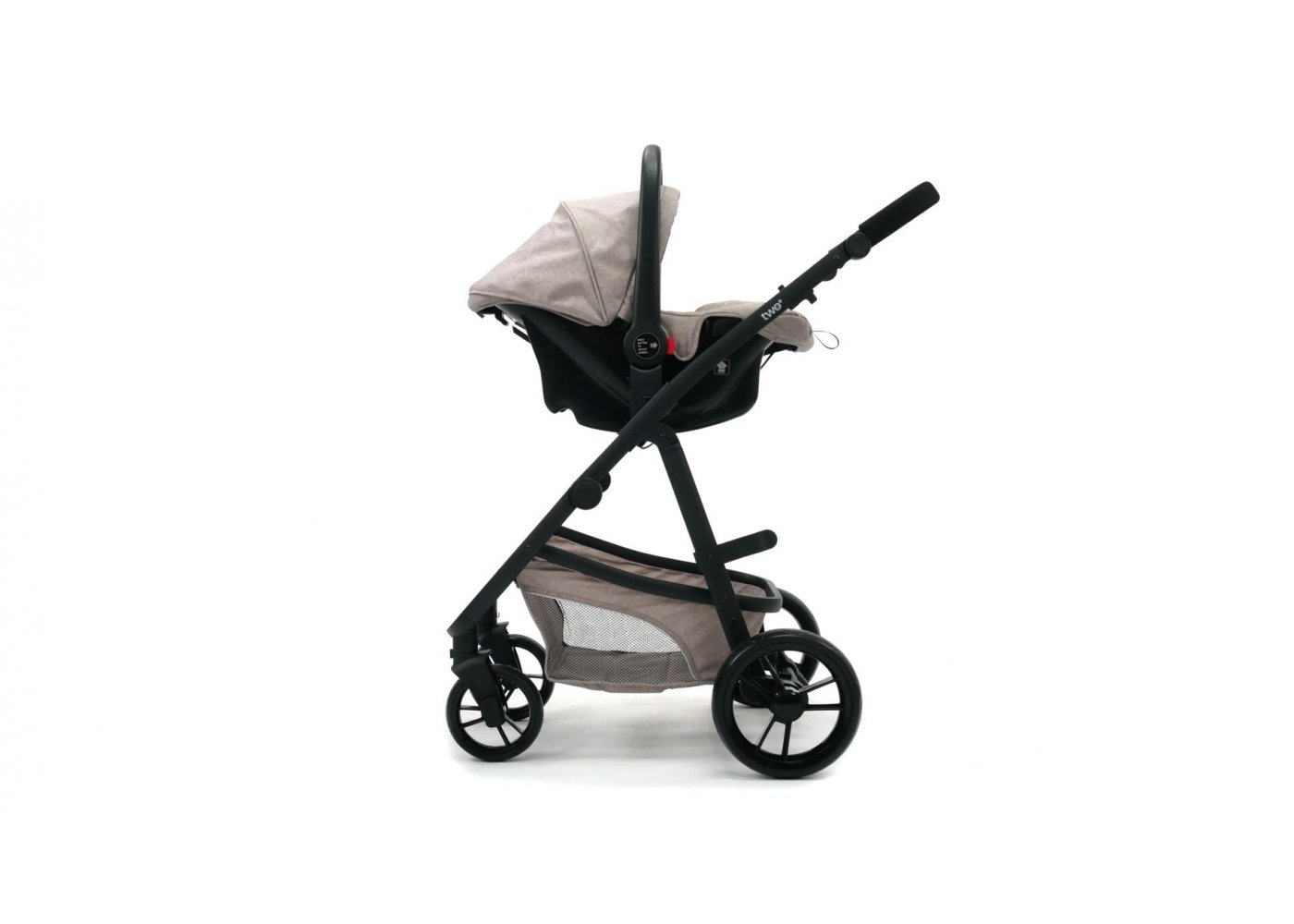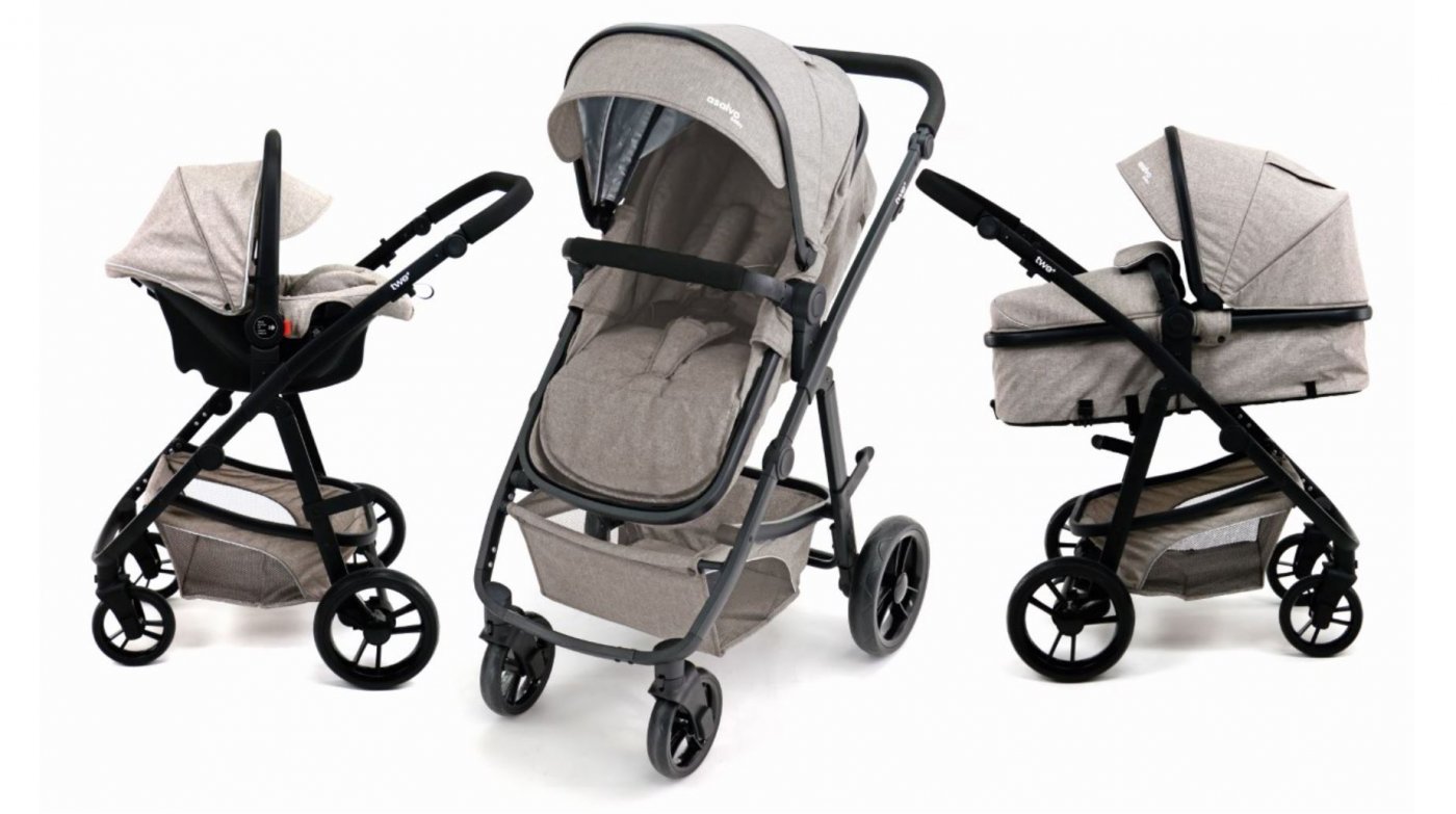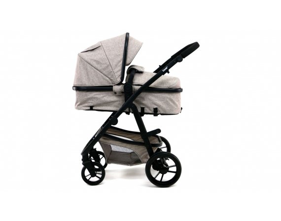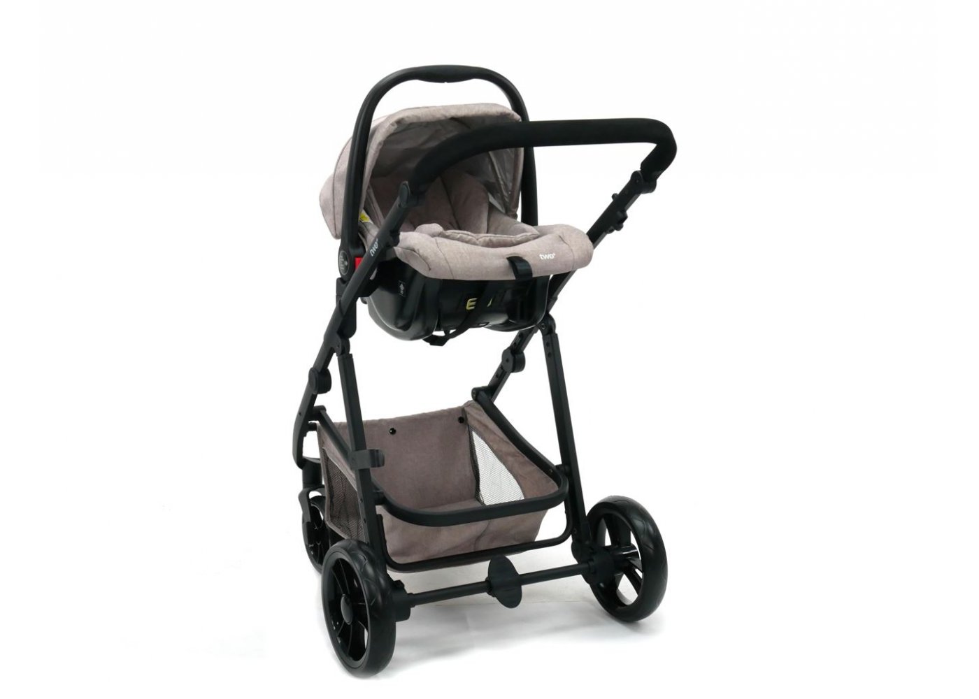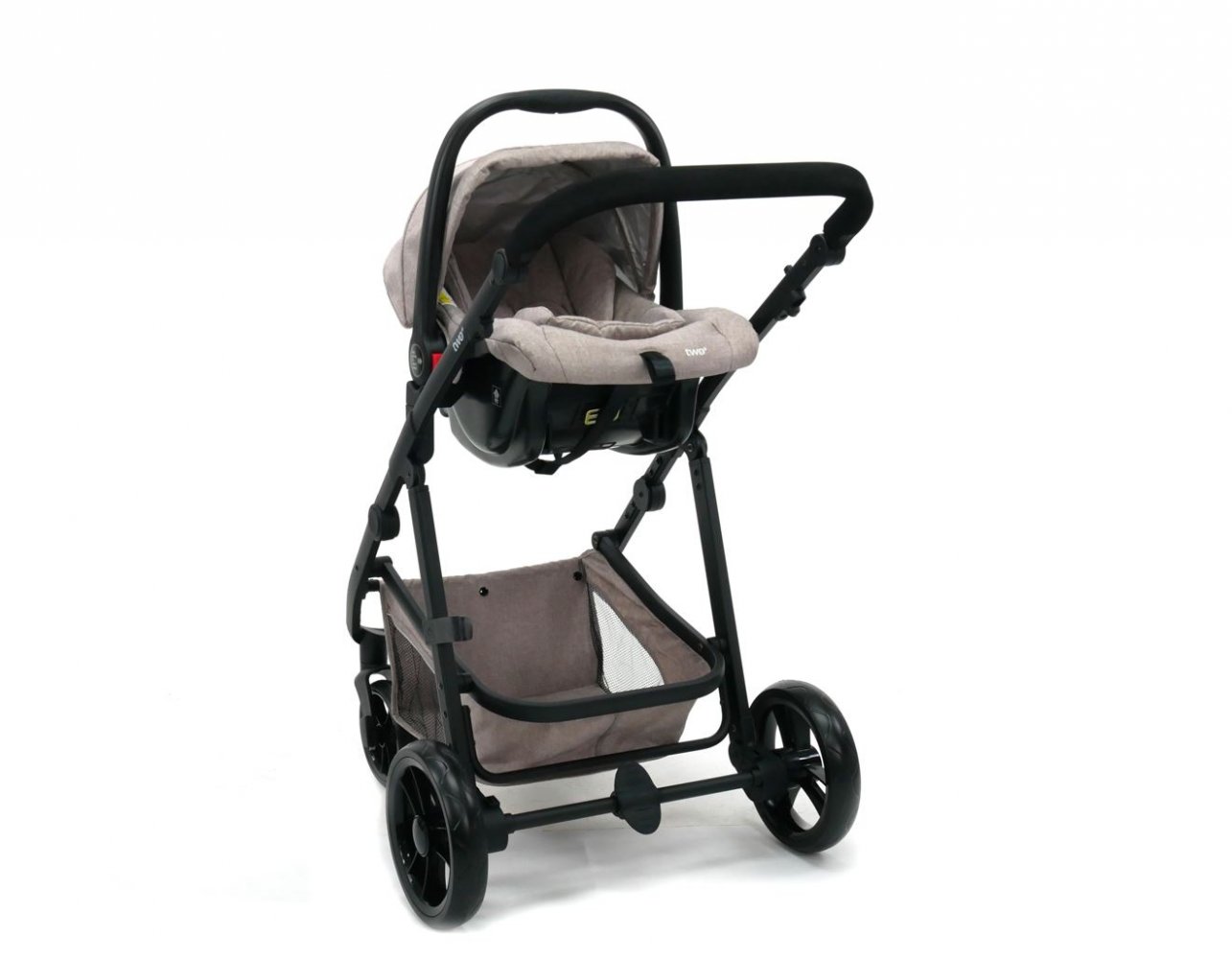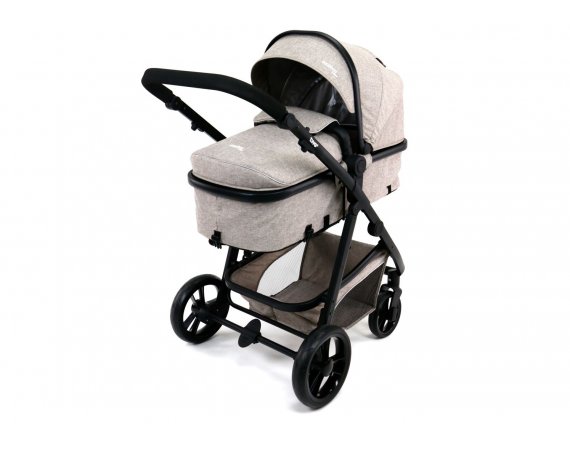Skønt barneudstyrssæt bestående af en autostol Gruppe 0 (0 - 13 kg.), et aluminiumsstel og et klapvognssæde der omdannes til barnevognslift i ét trin.