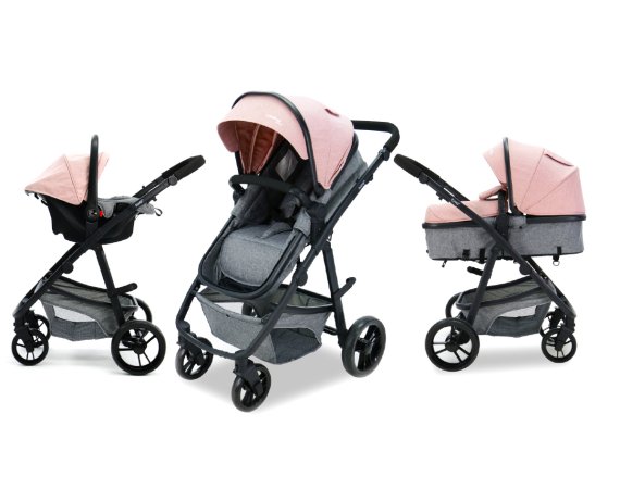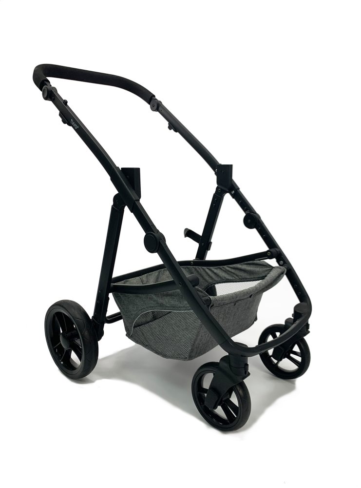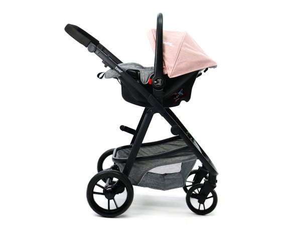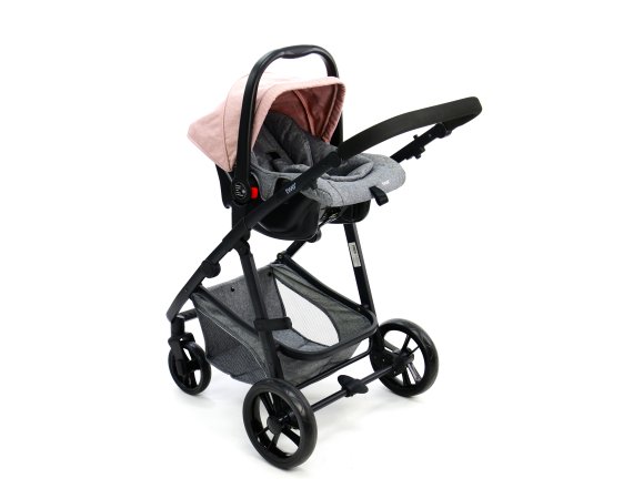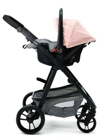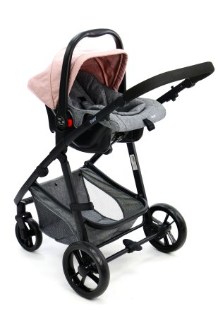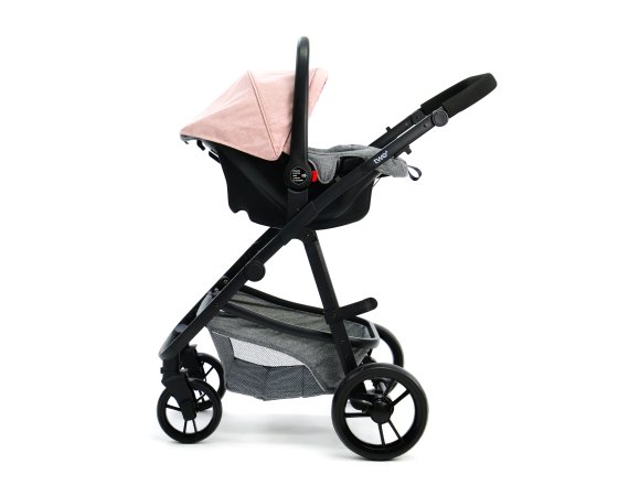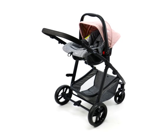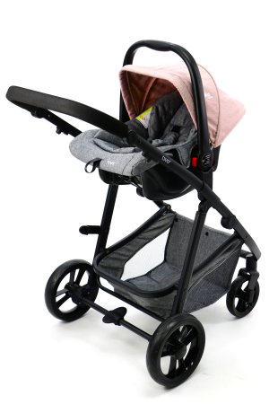 Skønt barneudstyrssæt bestående af en autostol Gruppe 0 (0 - 13 kg.), et aluminiumsstel og et klapvognssæde der omdannes til barnevognslift i ét trin.