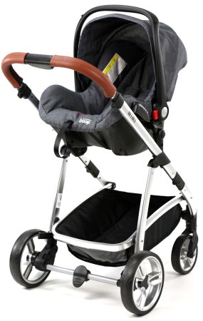 Asalvo Trio Wimi er bestående af klapvogn, lift med 3 cm tyk madras og en autostol gruppe 0+ med bærehåndtag.