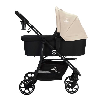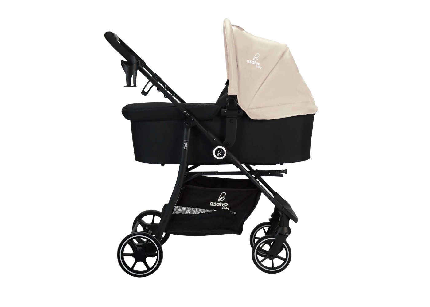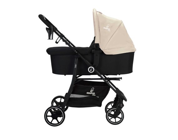 Asalvo Trio Oslo 2 med stålstel er et komplet sæt bestående af klapvogn, barnevognslift med en 3 cm tyk madras og en gruppe 0+ autostol med bærehåndtag.