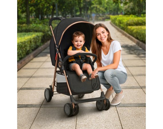 Den har et robust stålstel og en udvidelig kaleche, der giver ekstra solbeskyttelse. Den kompakte sammenklapning med sikkerhedslås gør den nem at opbevare, mens en aftagelig frontbøjle og hjul sikrer fleksibilitet. Det justerbare ryglæn med flere positioner tilpasser sig barnets behov, og affjedringen på alle fire hjul giver en behagelig køreoplevelse, uanset underlag.