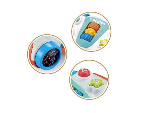 Kikkerten kan afspille musik, toner og sjove dyrelyde. Når mørket falder på kan kikkerten lyse børneværelset op med flotte og underholdende illustrationer. Man kan ikke se igennem kikkerten.