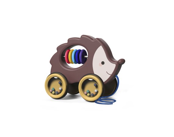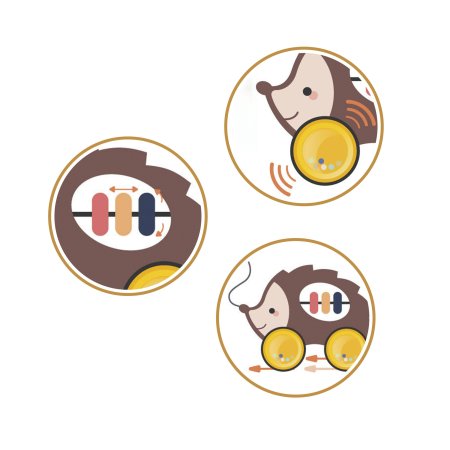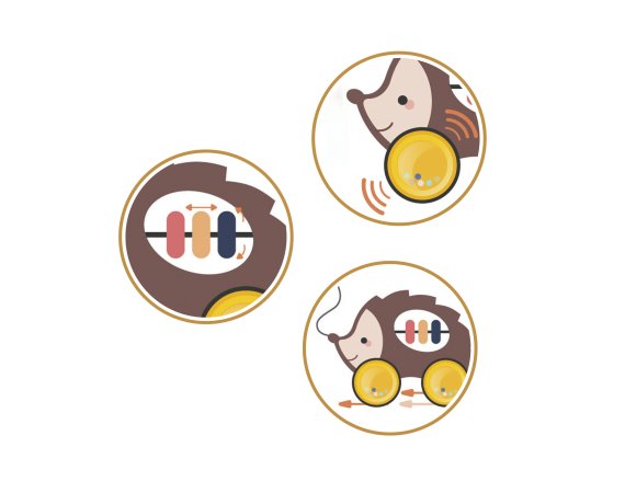 En sød lille ven til det lille barn, der lige har lært at gå. Pindsvinet har rangle-lyde i hjulene og små runde stykker på stang, der kan flyttes på og afgive sjove lyde.