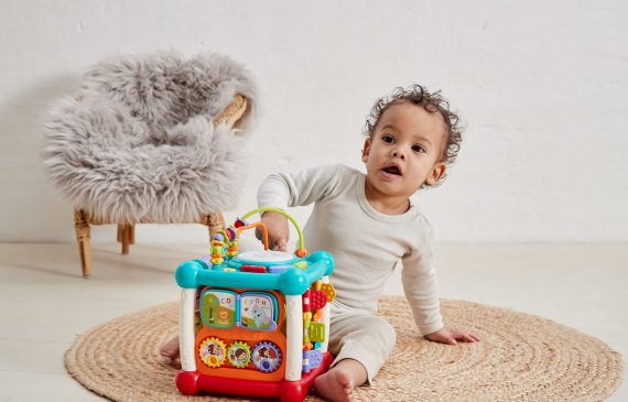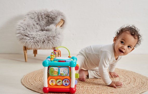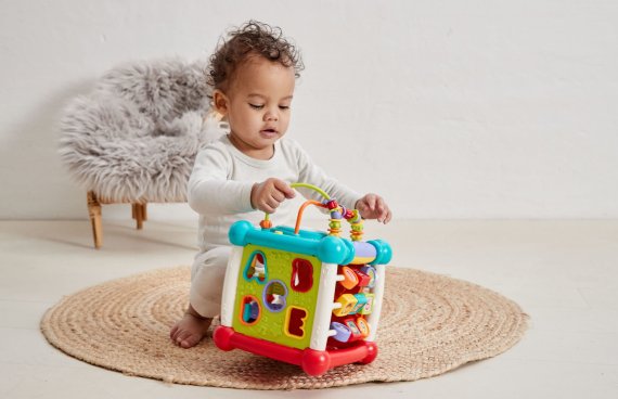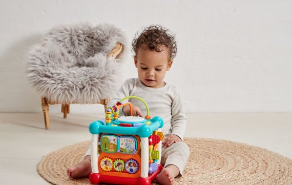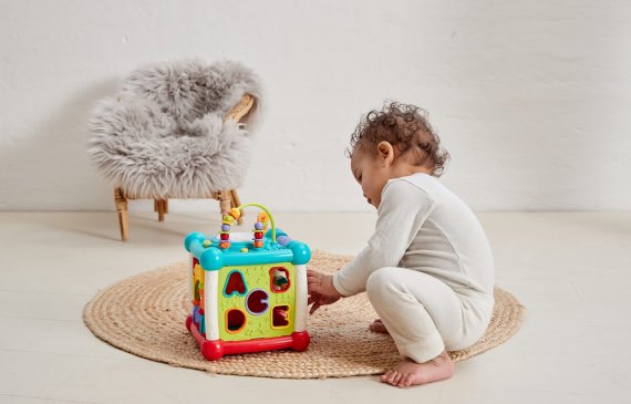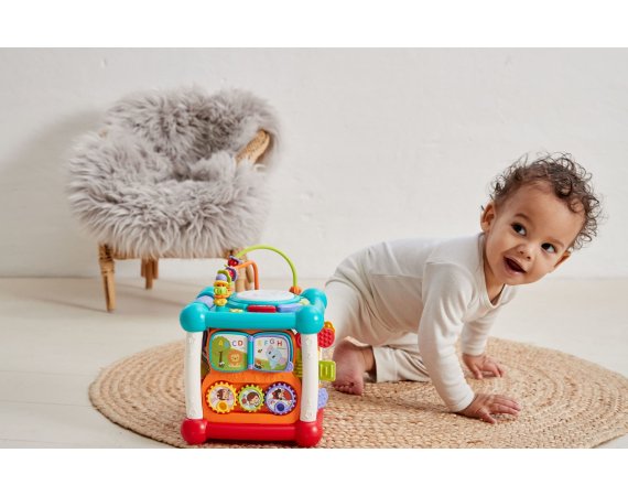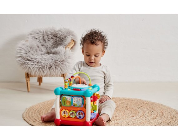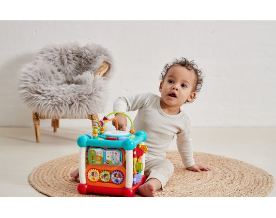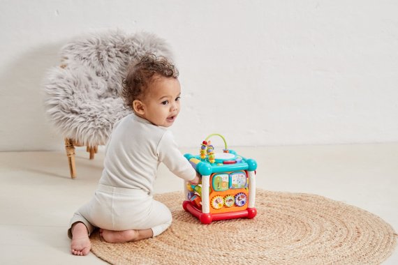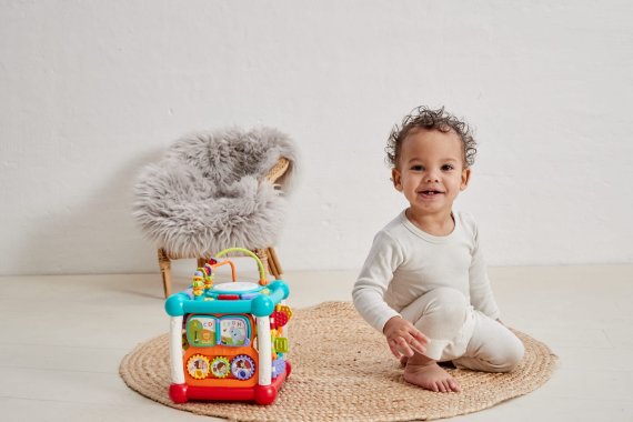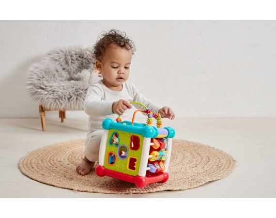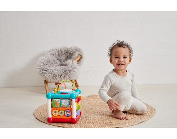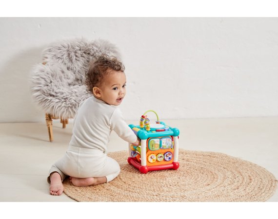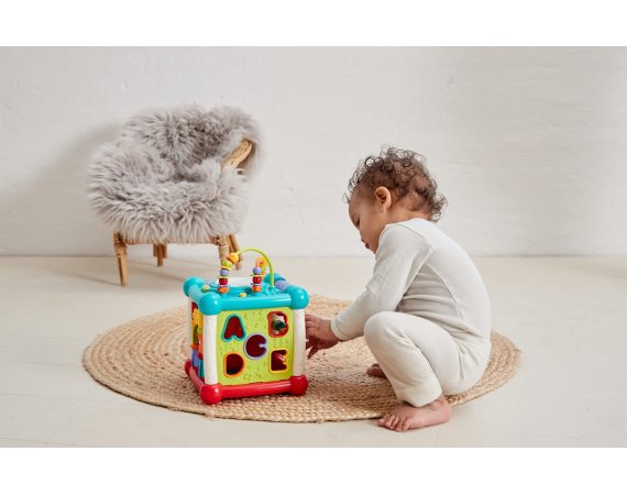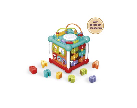 Aktivitetsterning der kan afspille musik via bluetooth, og som er fyldt med sjovt legetøj som tandhjul, klodser der kan drejes og meget mere. En terning med leg til flere timer stimulerende leg.