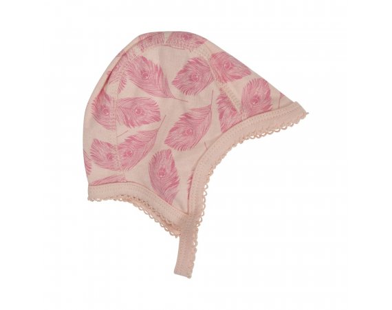 Super smart hue/ beanie i rosa med smukt fjerprint fra Petit by Sofie Schnoor.