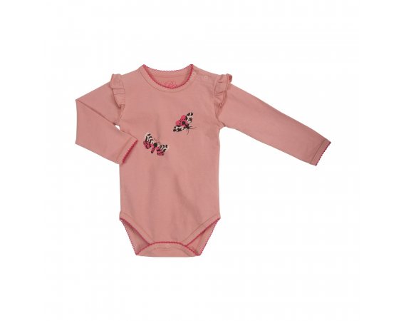 Bodyen har lange ærmer og er i en fin mørk coral farve og har flot print med sommerfugle foran.