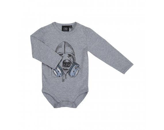 Bodyen har lange ærmer med smalle ribkanter i alle åbninger og er i en fin grå meleret farve. Den er pyntet med en hund iklædt et hættetrøje og headset med sølv-detaljer.