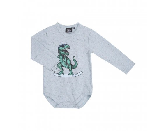 Bodyen er blåmeleret med et skønt print på forsiden af en grøn dinosaur med blå solbriller, der står på surfboard.