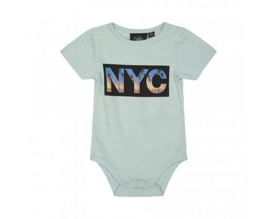 Bodyen har et NYC logo på brystet udfyldt med palmer og solnedgang.