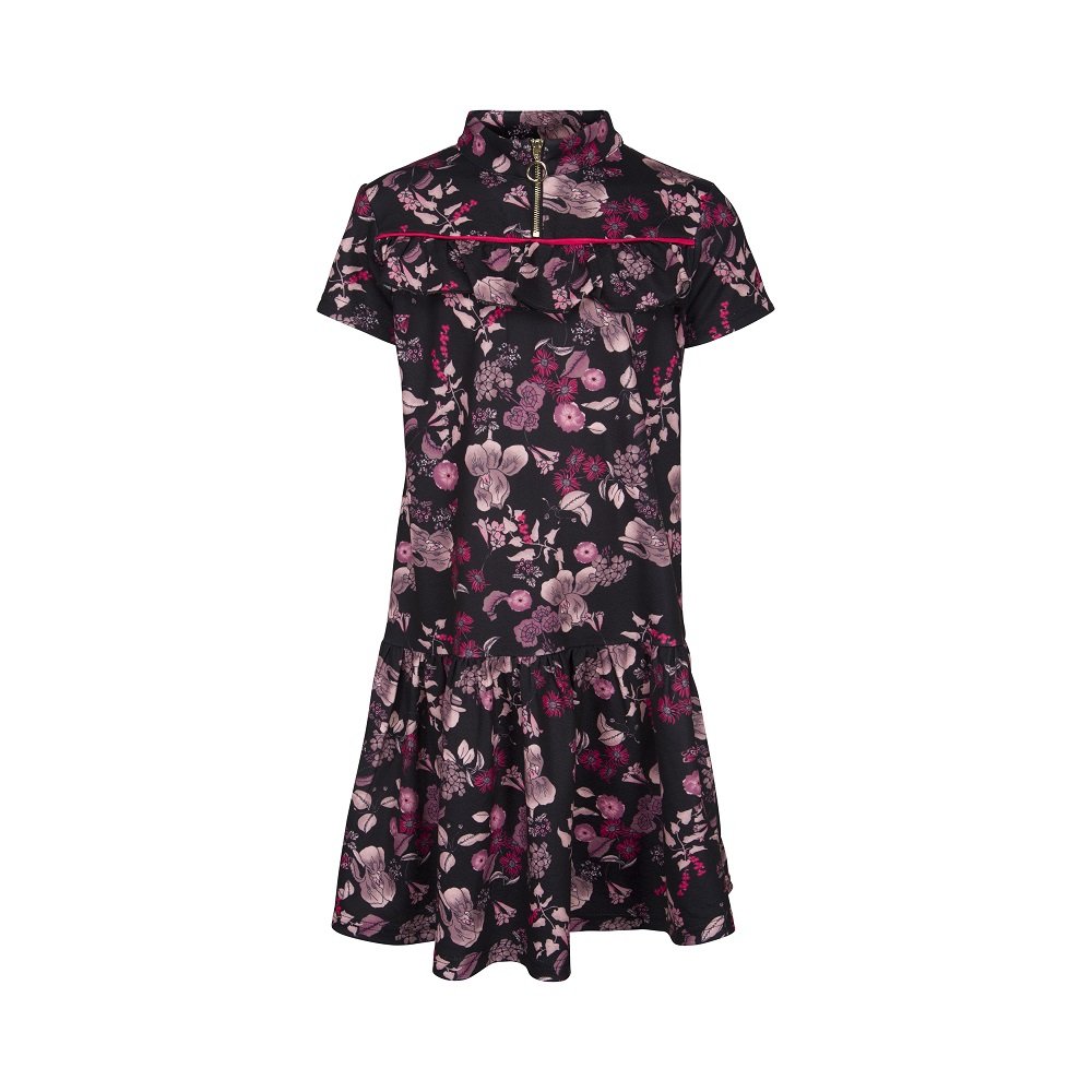 Kjole i sort med allover print af blomster i rosa nuancer og detaljer på brystet fra Petit by Sofie Schnoor