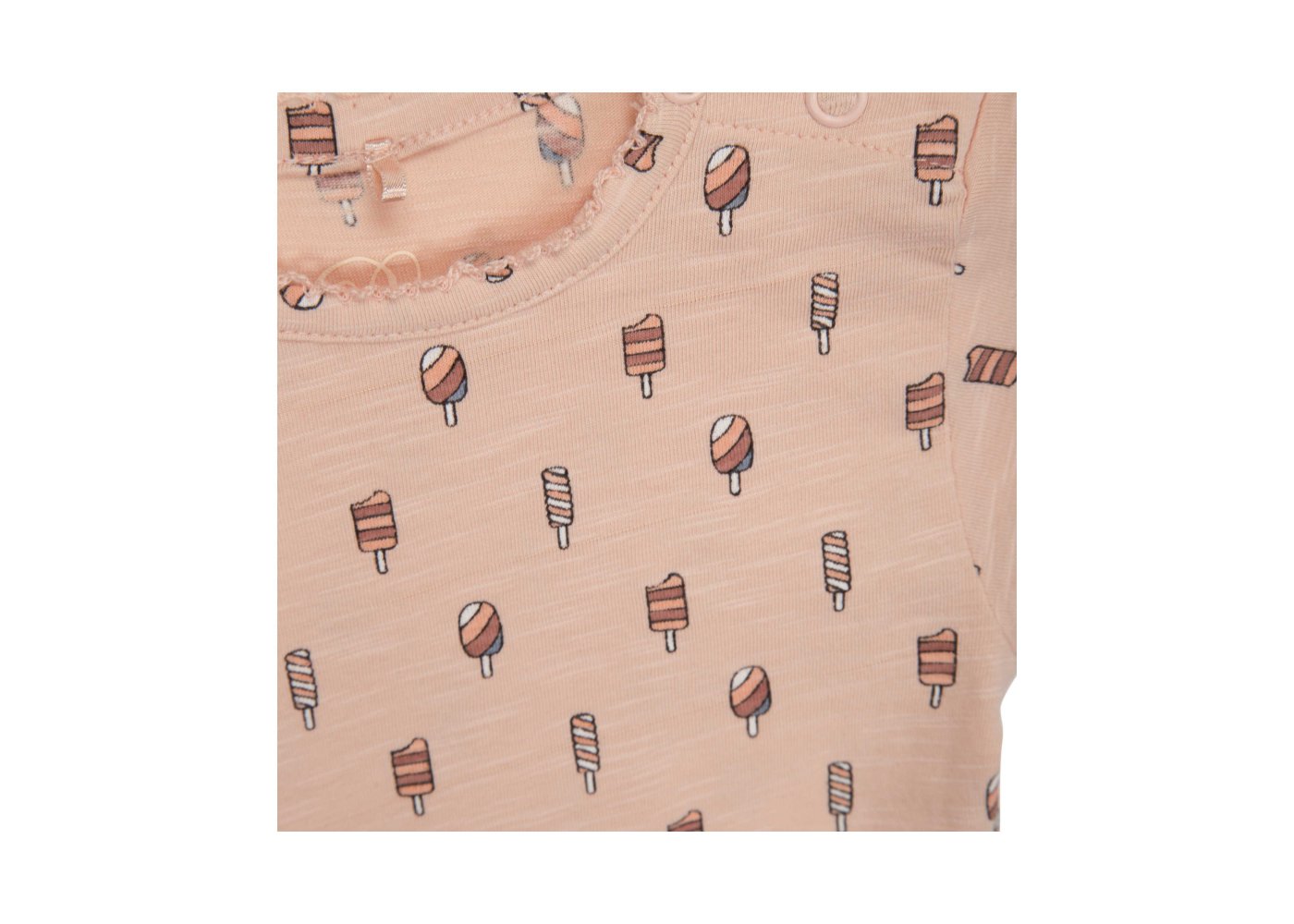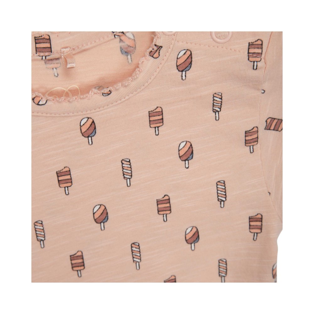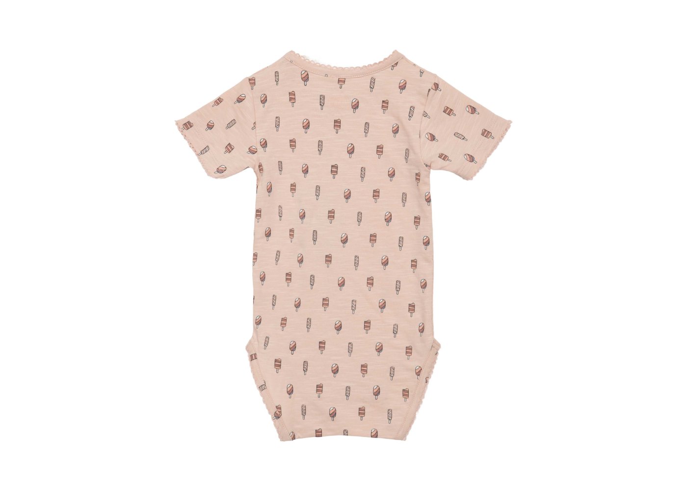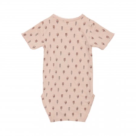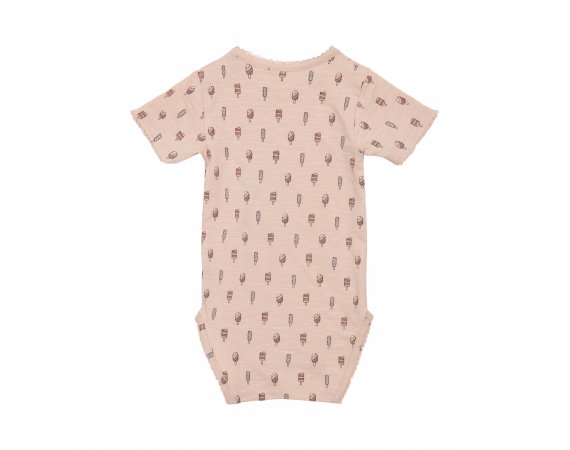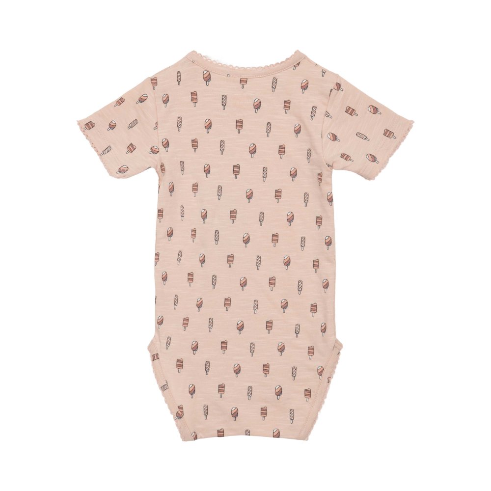 Sød body med korte ærmer og sjove ispinde print på frontenBodyen har søde blondekanter i alle åbninger og lukkes med trykknapper på venstre skulder og imellem ben.