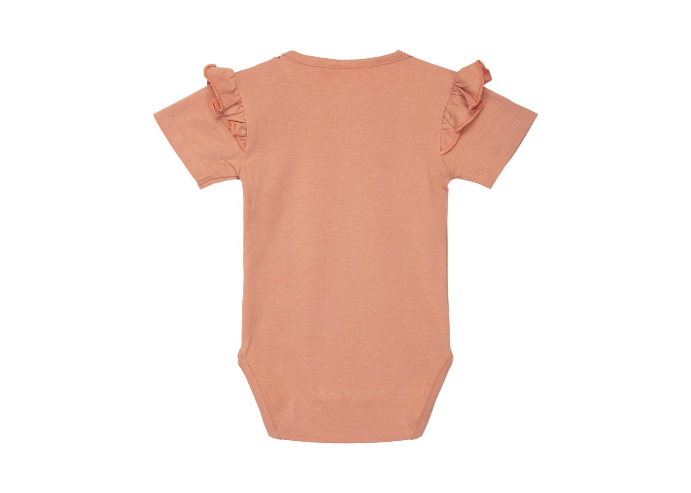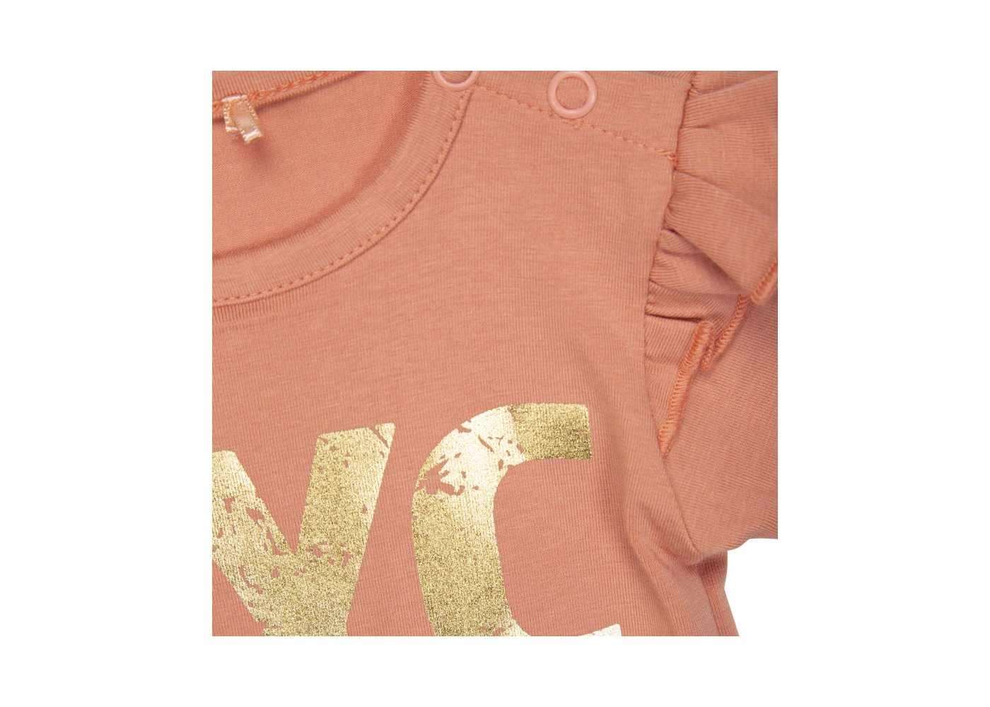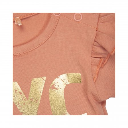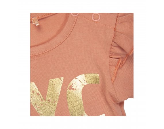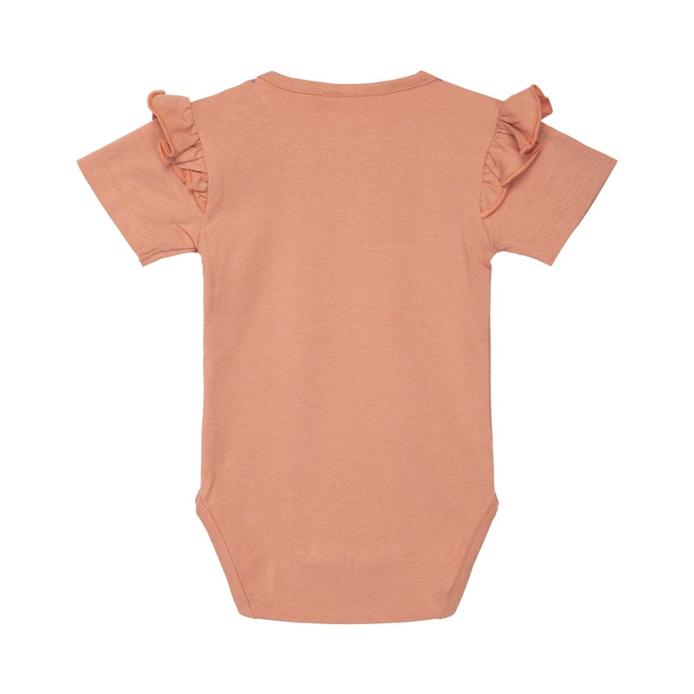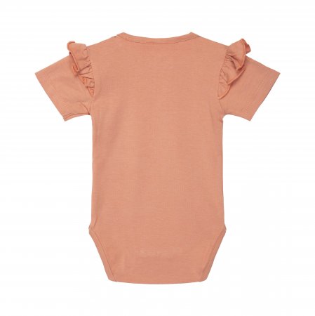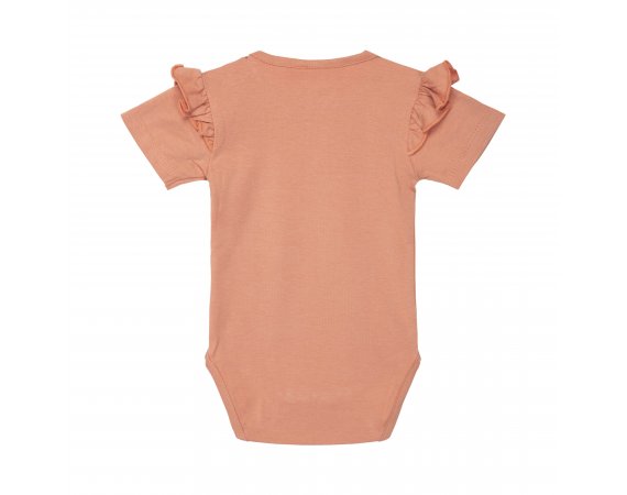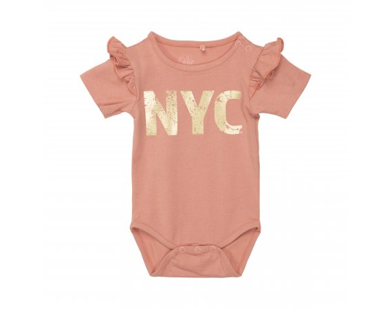 Sød body med korte ærmer og flot NYC print på frontenBodyen har søde flæsekanter på skuldre og lukkes med trykknapper på venstre skulder og imellem ben.