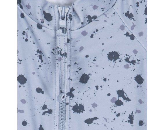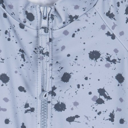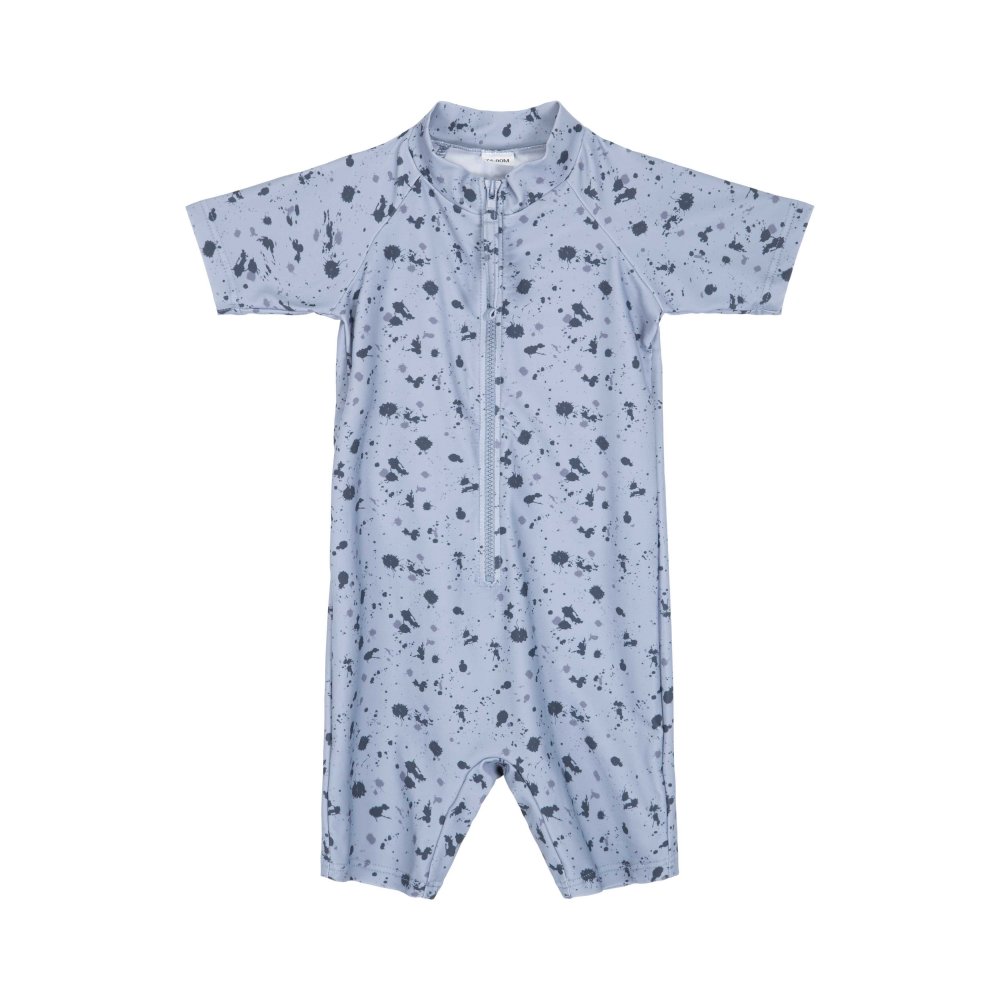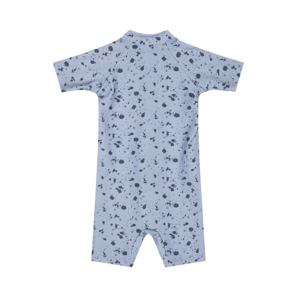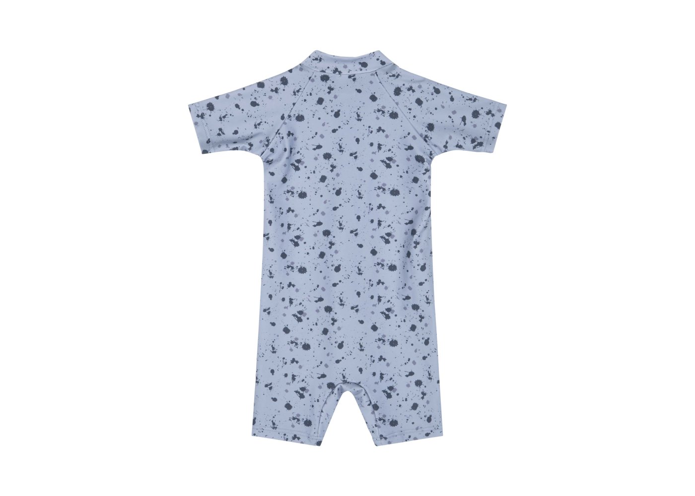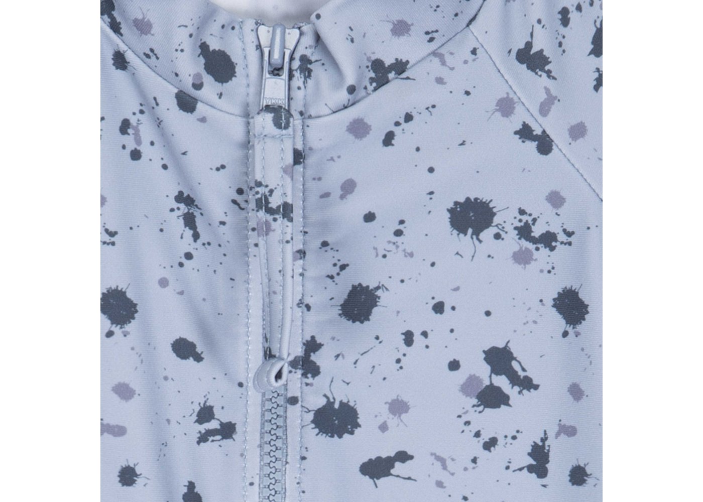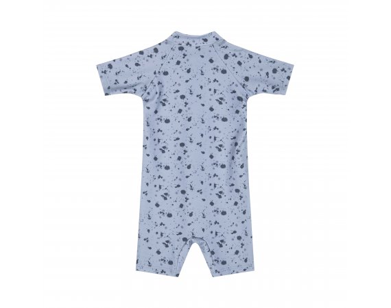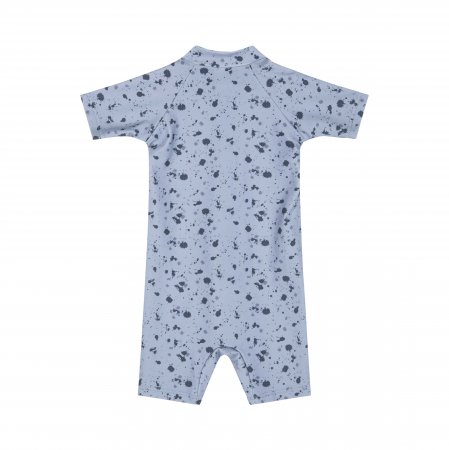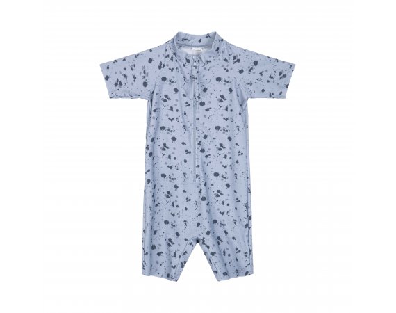 Sej lyseblå UV svømmedragt med sjove malerplette printBadeheldragt med korte ærmer og ben. Dragten åbnes fortil med lynlås med en indvendig vindstolpe og hagebeskytter.