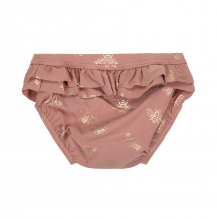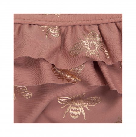 Søde UV ble-badebukser med flæser og bi guld printBadebukser med to fine flæsekanter, indvendig elastikkant og justerbar bindebånd i taljen.