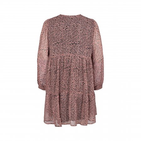 Smuk langærmet kjole i lag med rynk og viddeSort kjole med et rosa mønster, og ærmer med brede smock elastikkanter.