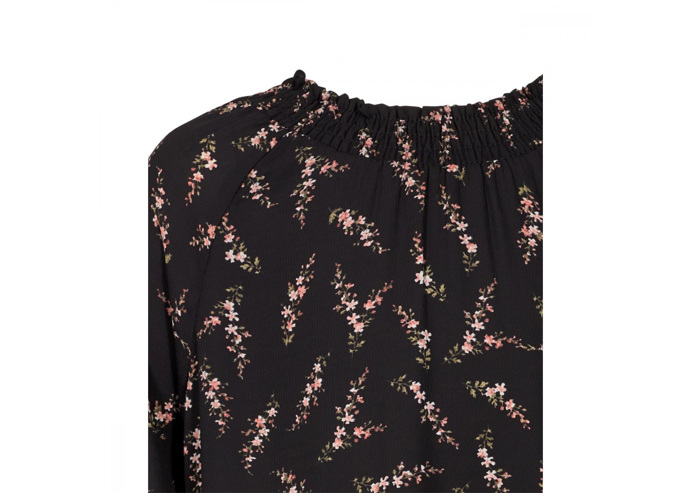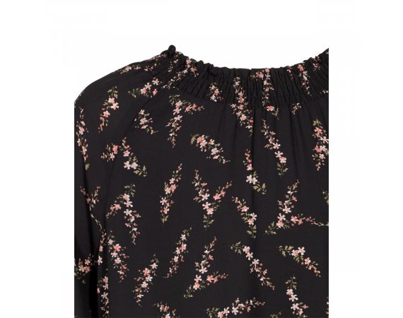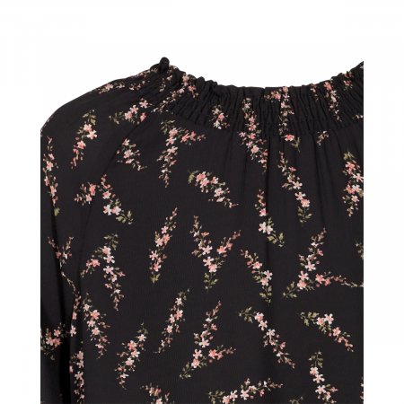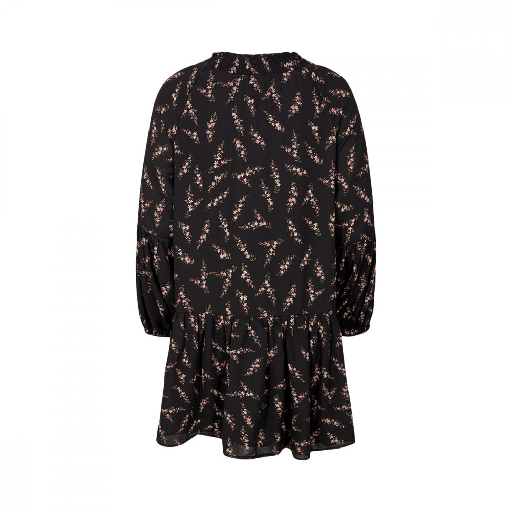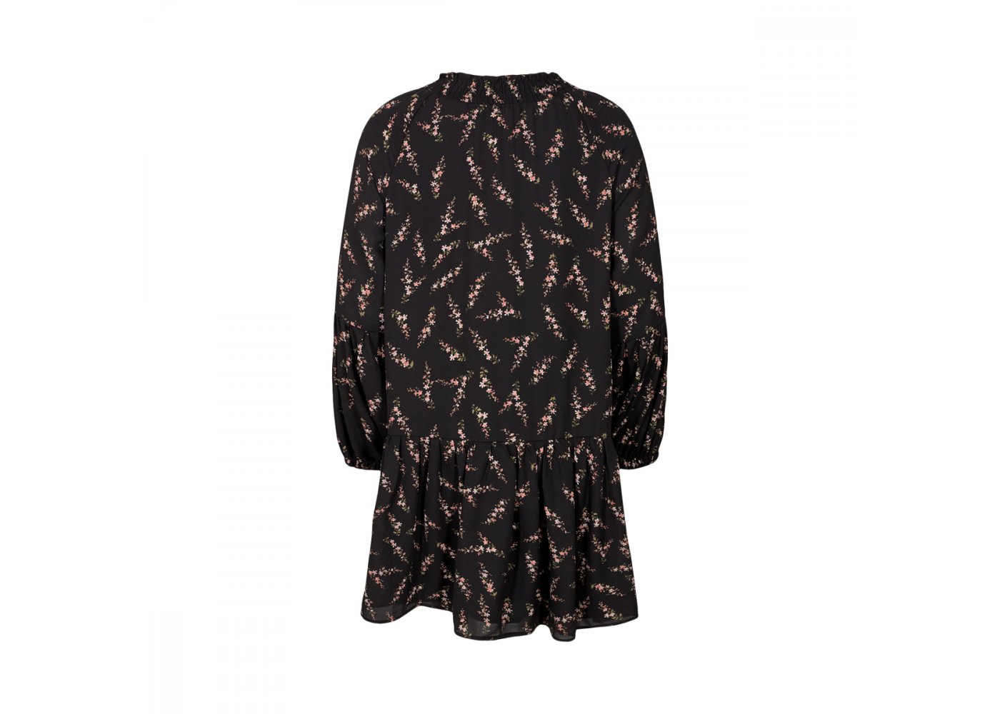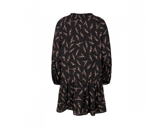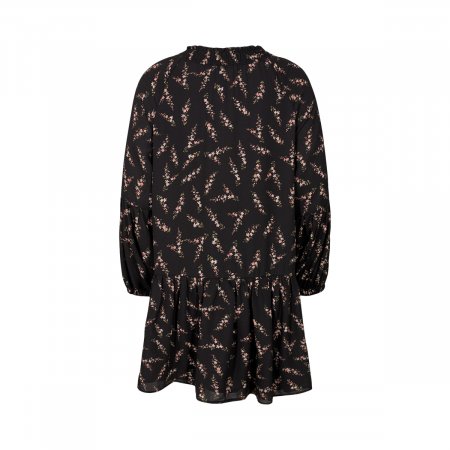 Smuk langærmet kjole i lag med rynk og viddeSort kjole med et rosa og grønt blomsterprint, og en bred smock elastikkant i hals.