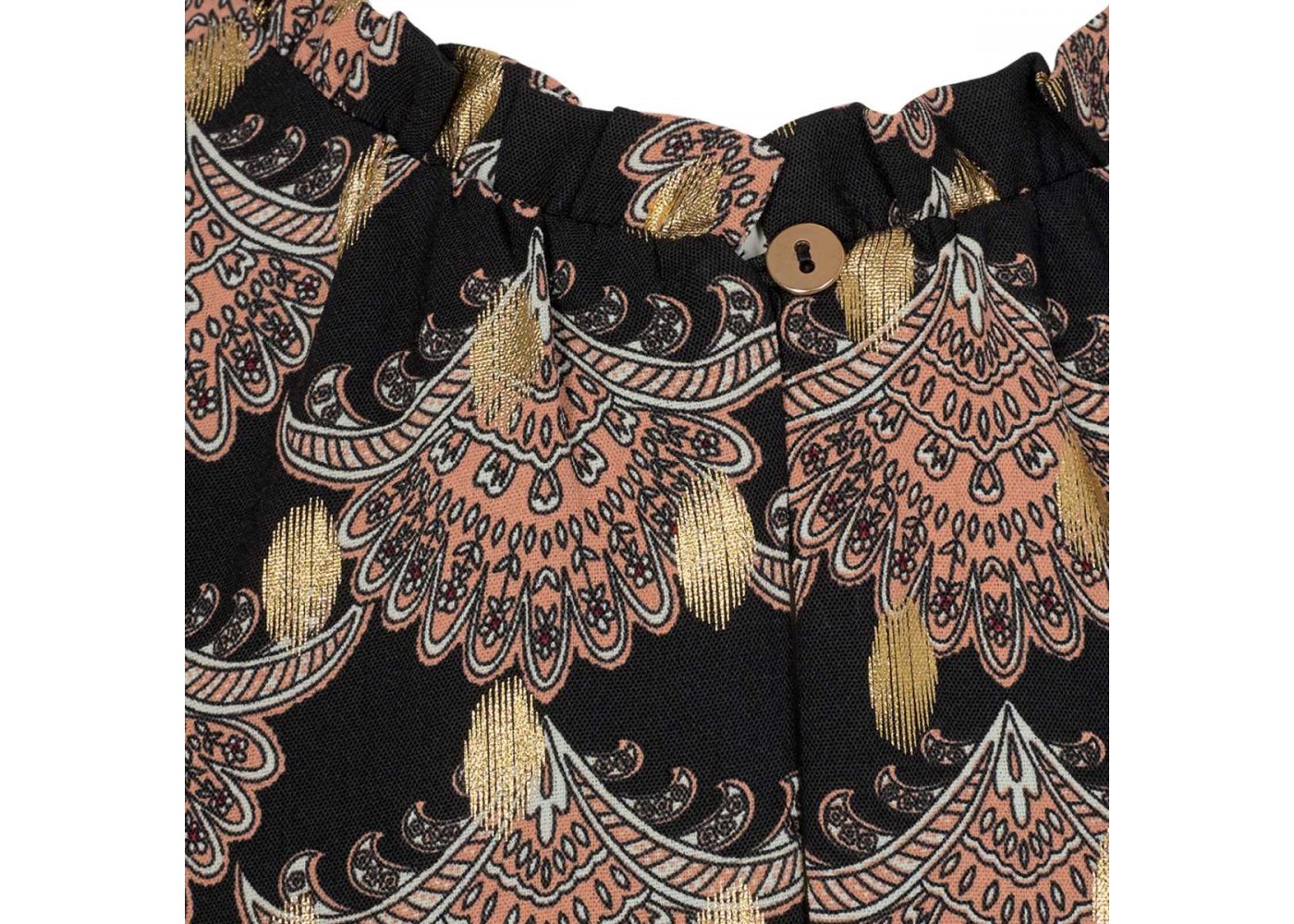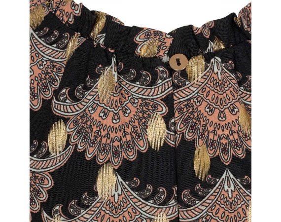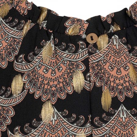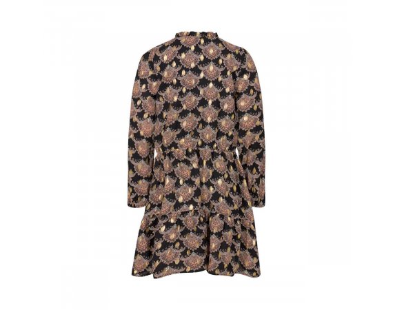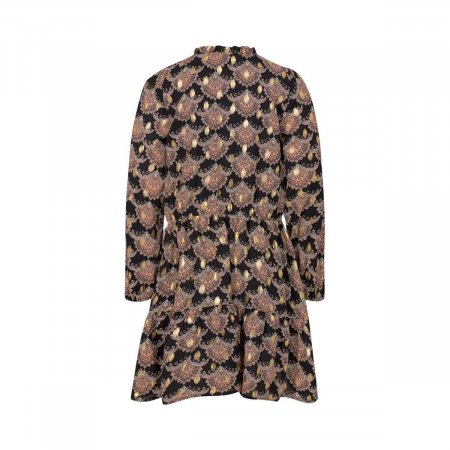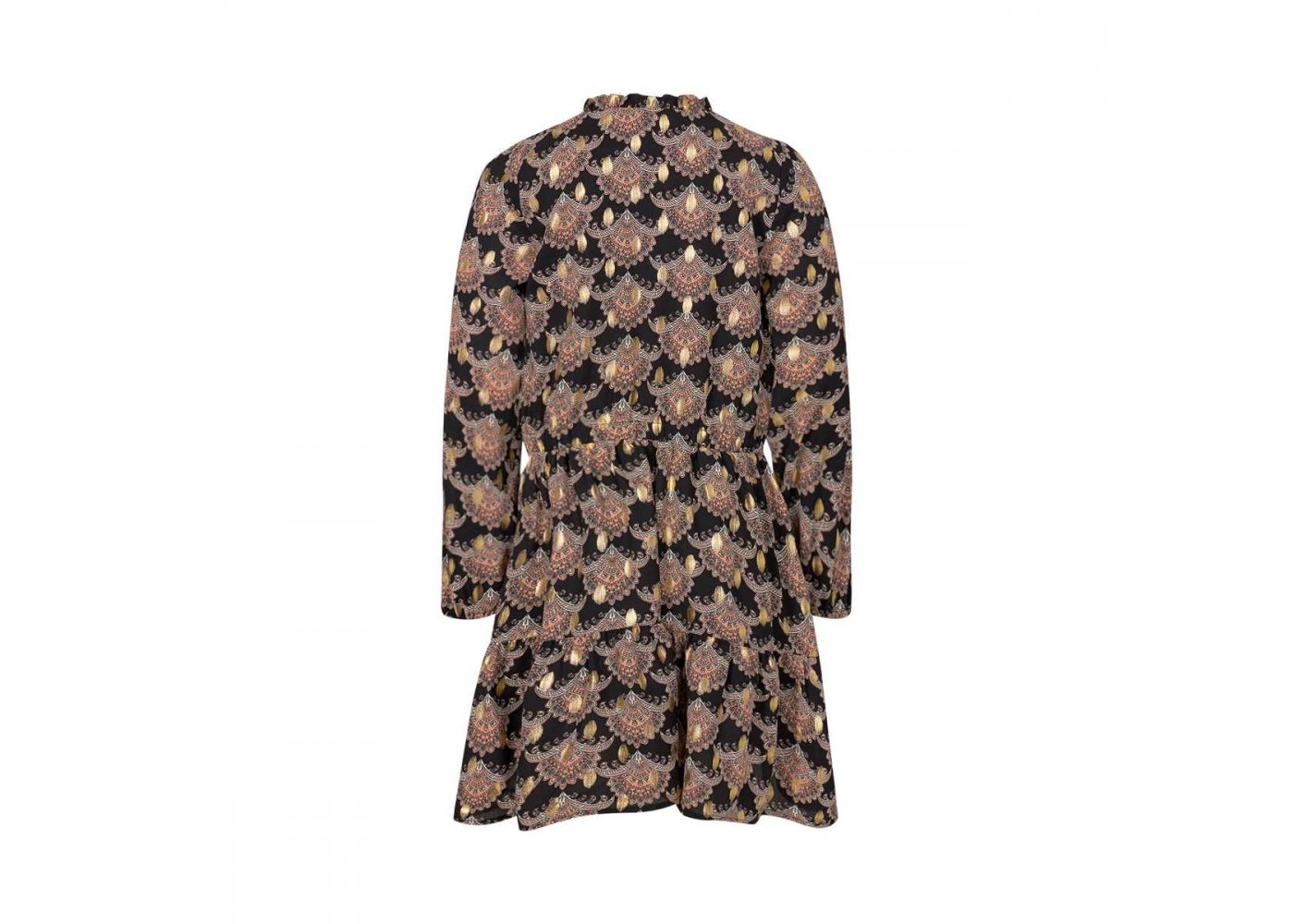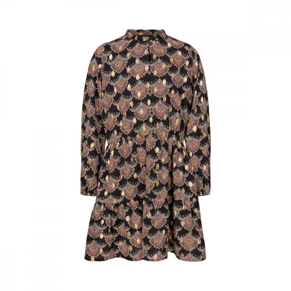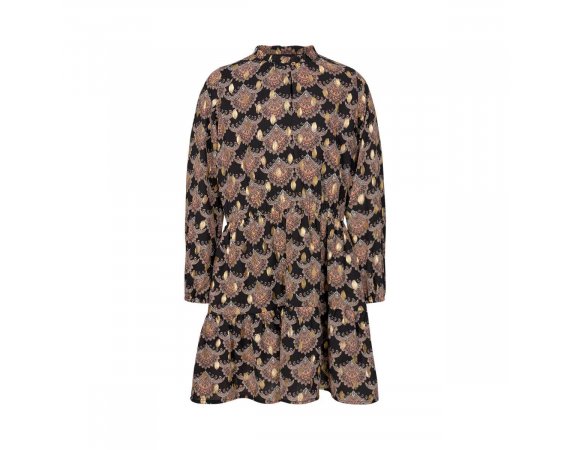 Flot langærmet kjole med med skønt mønsterprint.Kjolen er sort i bunden, og har print med orange og fine guldprikker. Den går op i halsen og har en flot guld knappeåbning foran. Kjolen har elastik i taljen og et sødt flæseskørt, som giver den et flot fald.