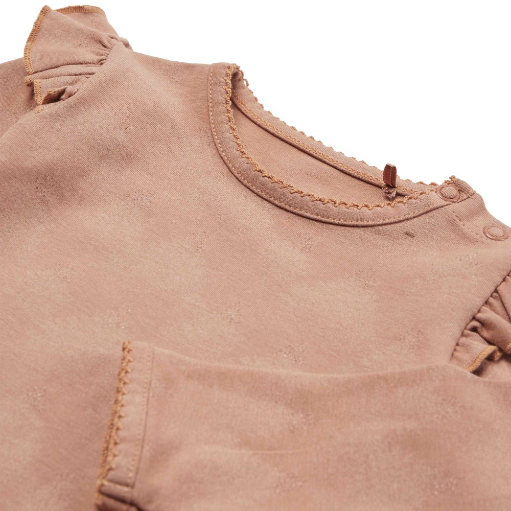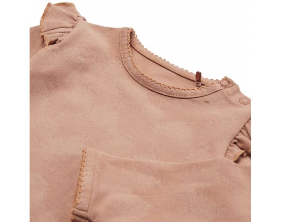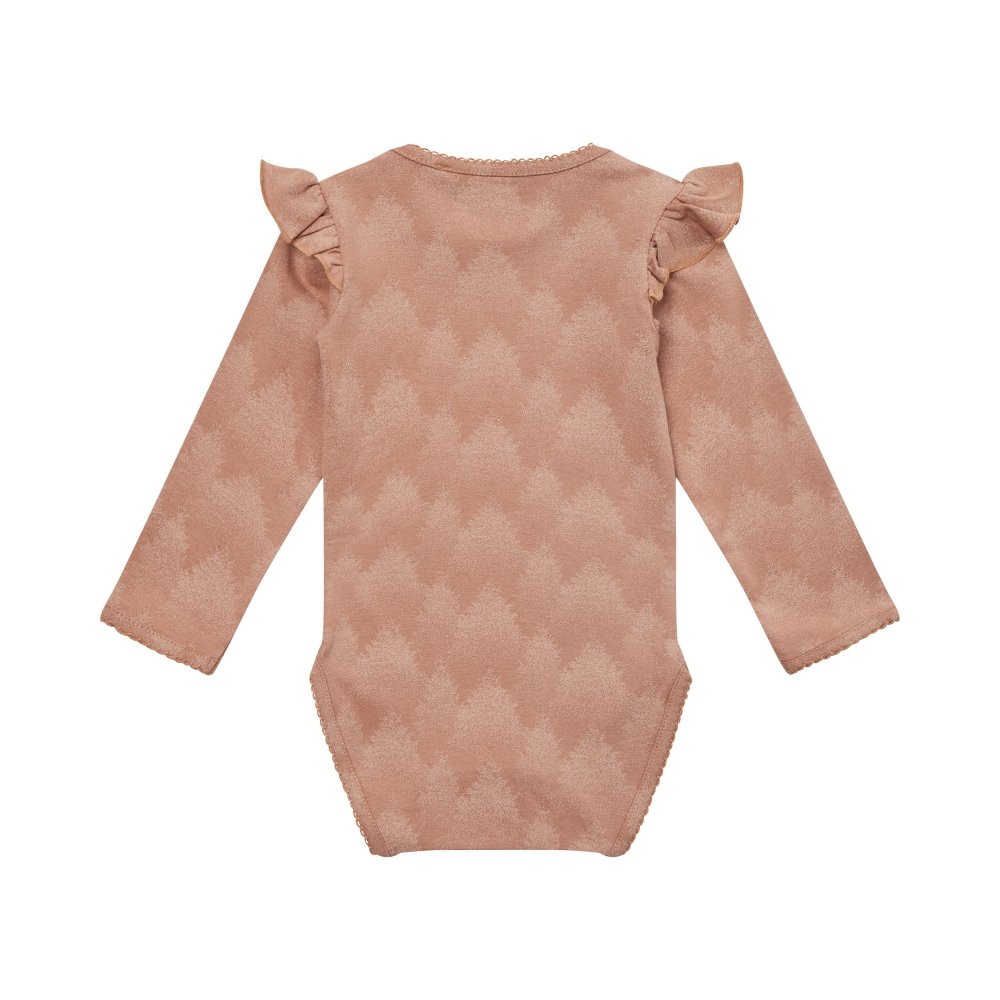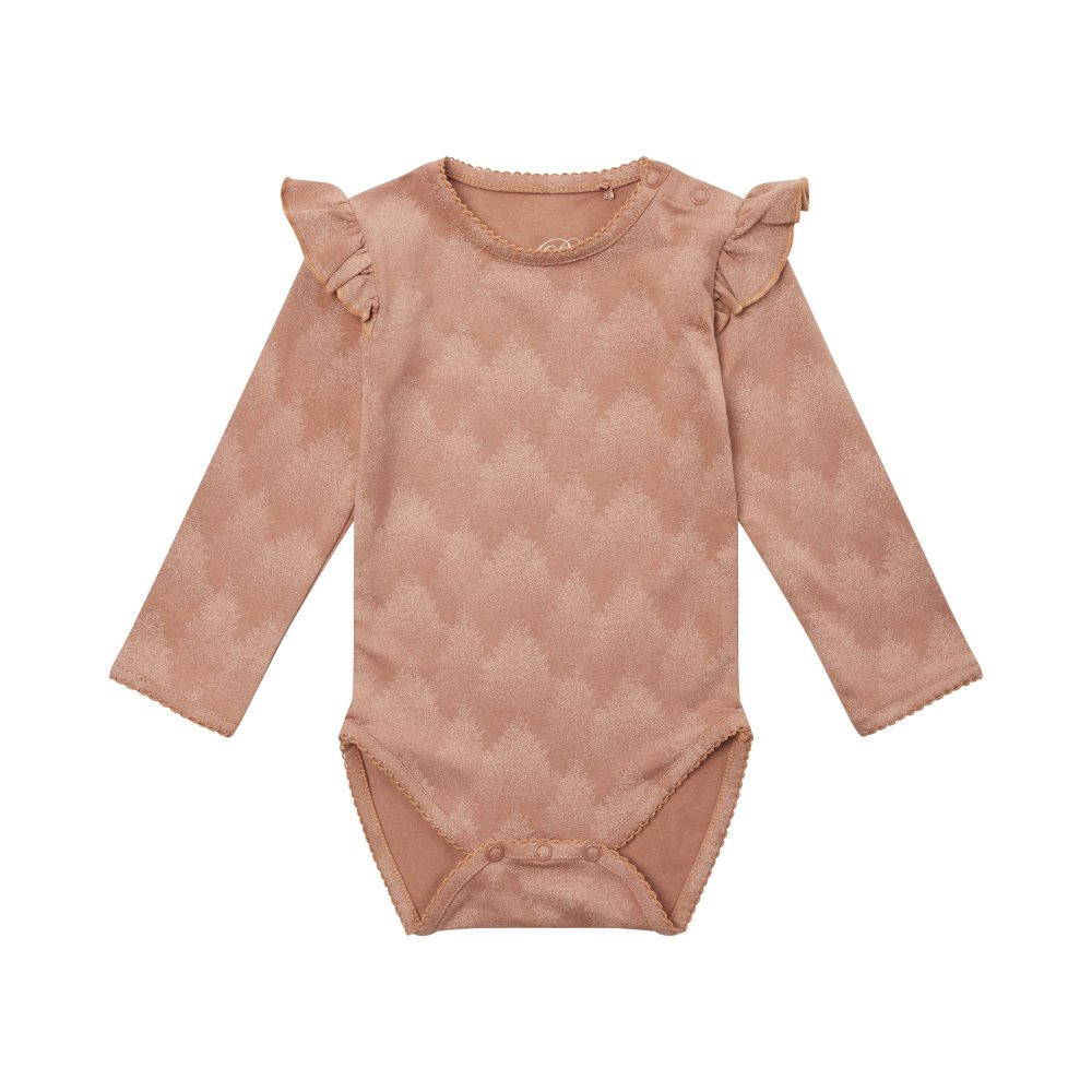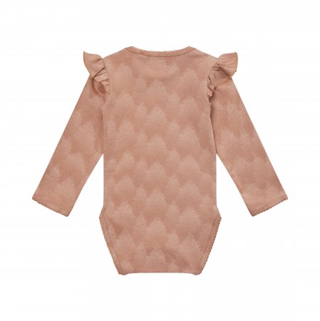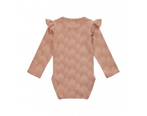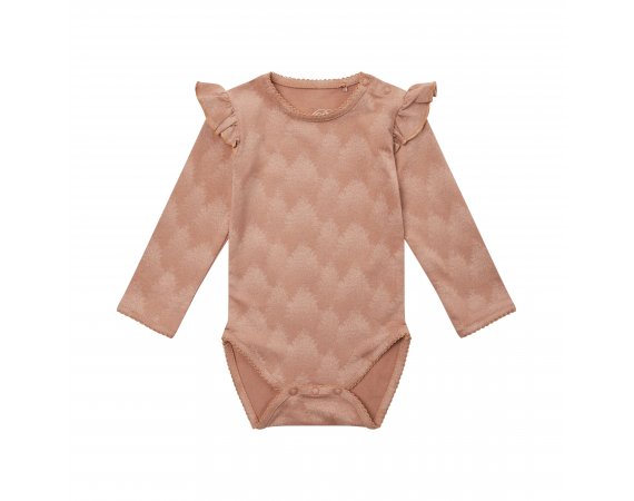 Yndig body med lange ærmer og flæser ved venstre skulder.
