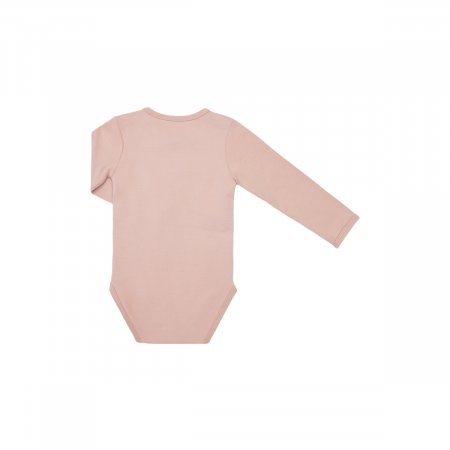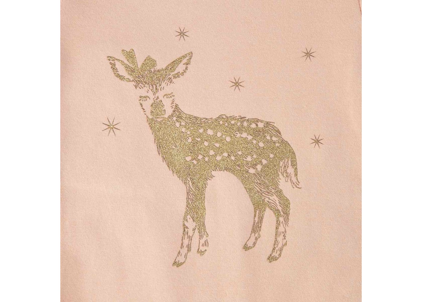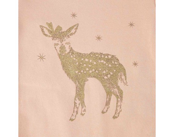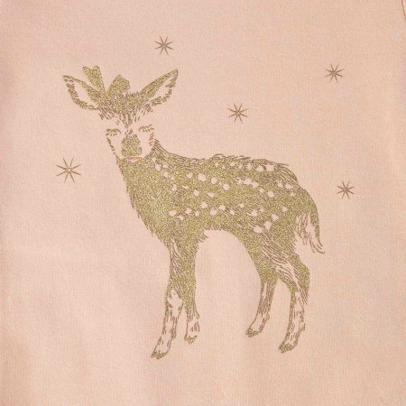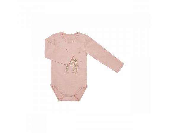 Sød body med lange ærmer og et flot rådyrprint i guld på fronten. Bodyen har smalle ribkanter ved alle åbninger og lukkes med trykknapper ved venstre skulder og imellem ben. Tekstil: 95% bomuld, 5% elastan