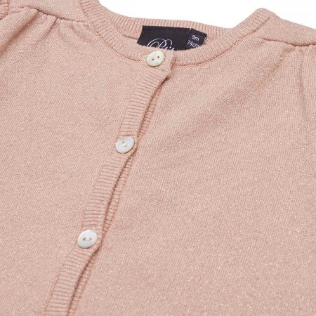 Yndig strik cardigan med fine smalle ribkanter og knapper ned foran.Trøjen har fine flæsedetaljer på skuldre og lidt rynk foran.