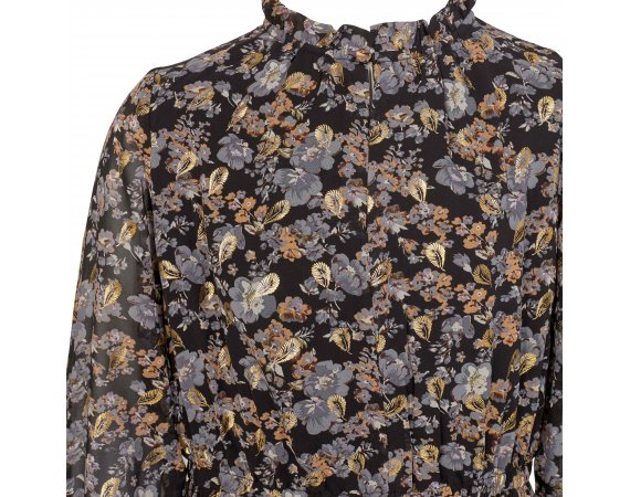 Kjolen har lange ærmer med elastikkant, rund halsudskæring med flæsekant og åbnes fortil med en fin guldknap.