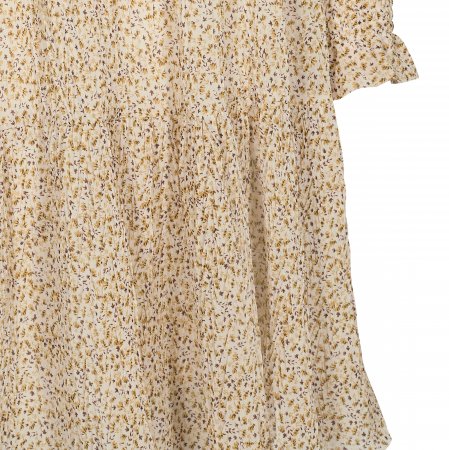 Skøn Petit by Sofie Schnoor kjole med blomster i gule og brune nuancer.Kjolen har lange ærmer, er overskåret flere steder og rynket, som giver kjolen flot fylde og vidde. Den åbnes foran med knap i en dråbeformet åbning. Kjolen er i to lag, hvor det inderste lag sikrer, at kjolen ikke er gennemsigtig.