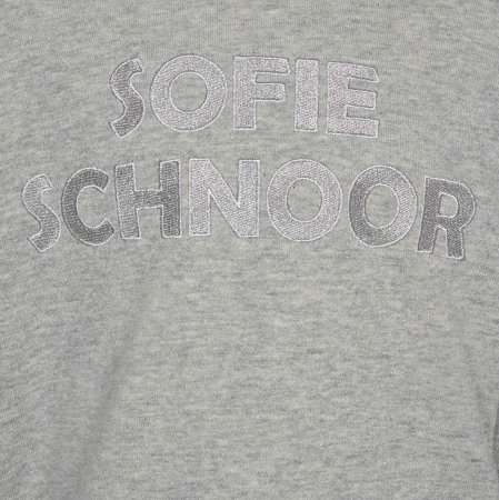 Smart grå og bredt anvendelig sweatshirt med hætte og Sofie Schnoor skrift på brystet.