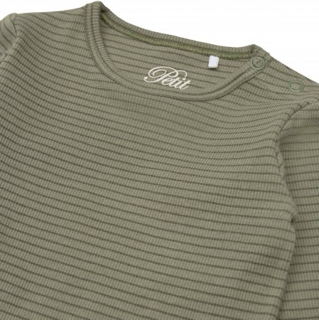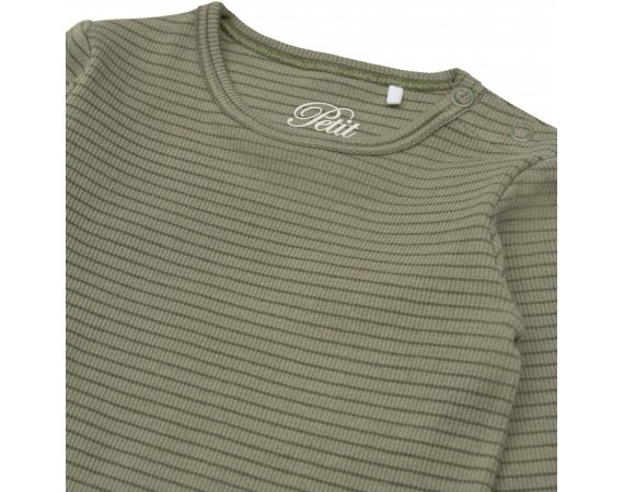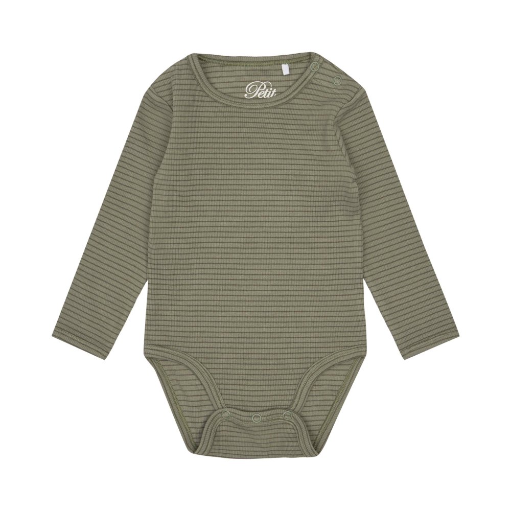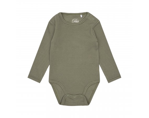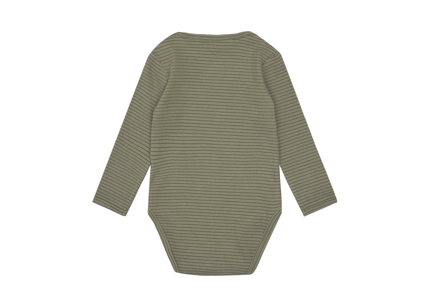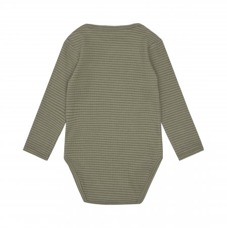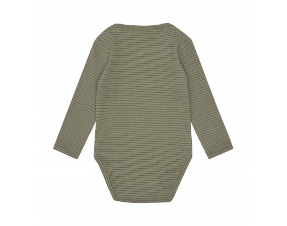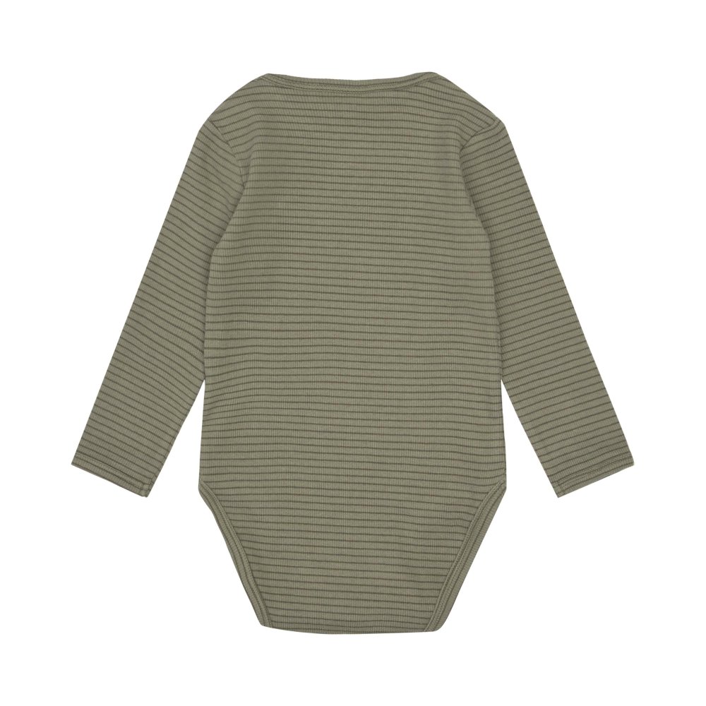 Smart langærmet rib body fra Petit by Sofie Schnoor i en blød og strækbar bomuldskvalitet.Bodyen er i en støvet grøn farve med smalle, mørke grønne striber. Den har en smal ribkant i alle åbninger og lukkes med trykknapper på venstre skulder og imellem ben.