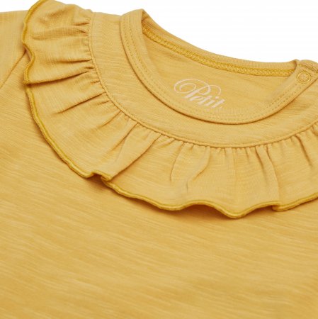Yndig langærmet body fra Petit by Sofie Schnoor i en blød og strækbar bomuldskvalitet.Bodyen er i gul farve og har en flot flæse foran i halsudskæringen. Den har en smal ribkant i alle åbninger og lukkes med trykknapper på venstre skulder og imellem ben.