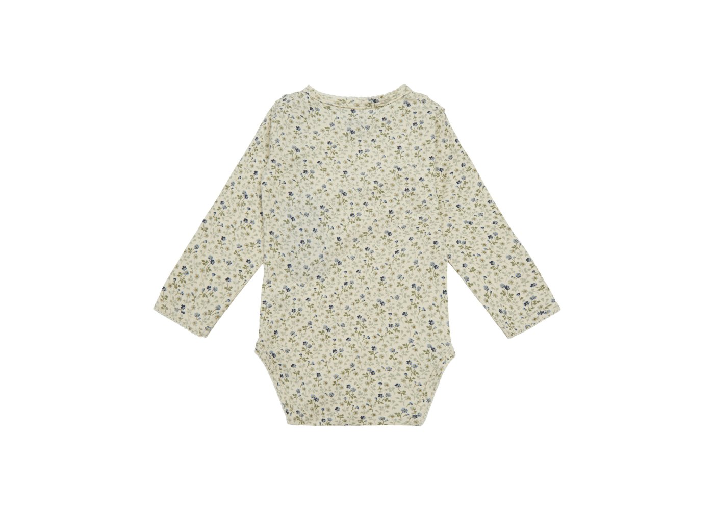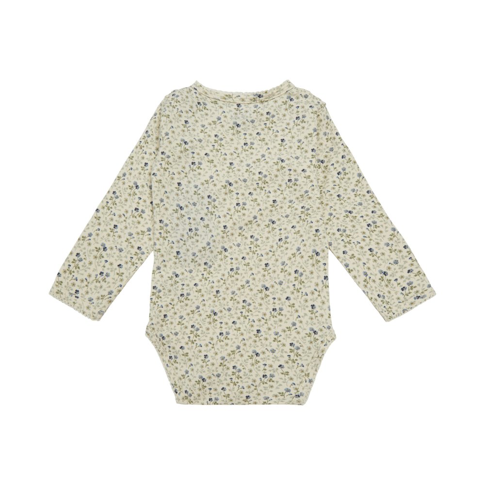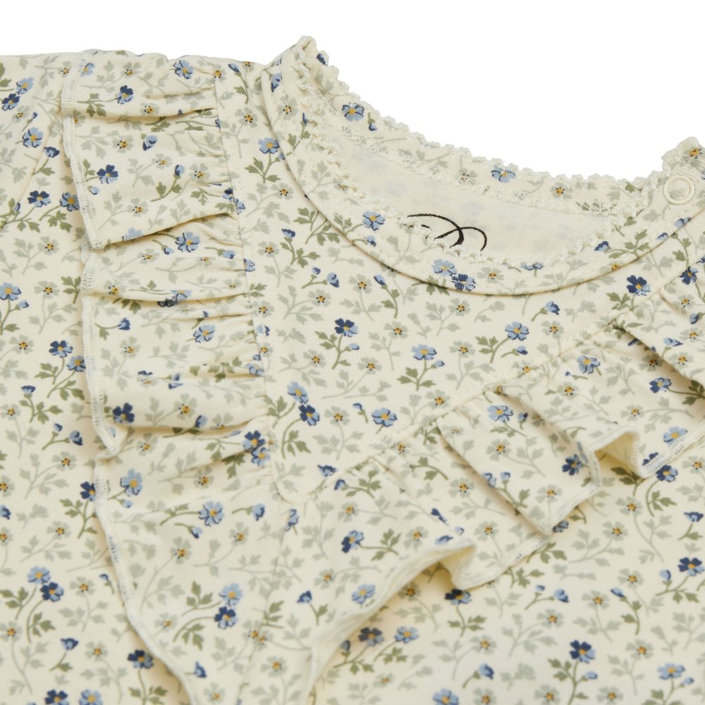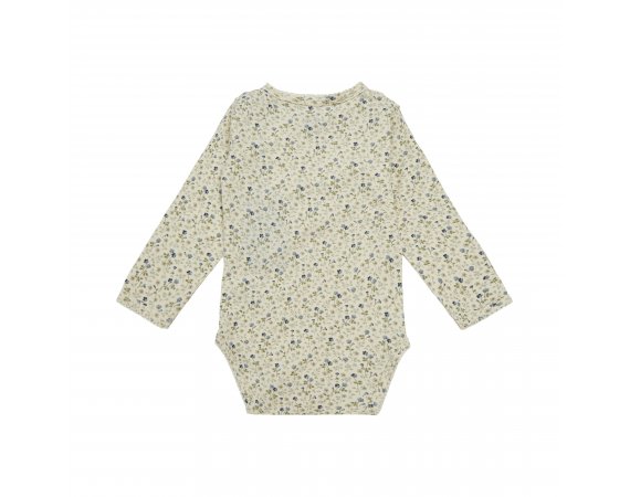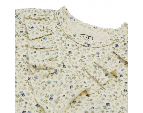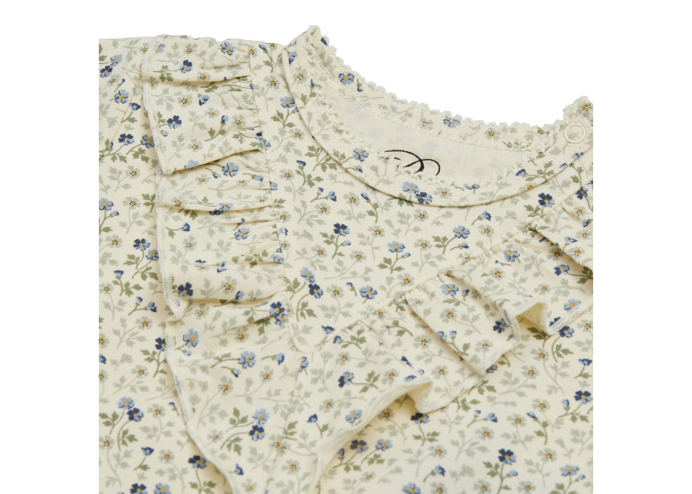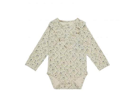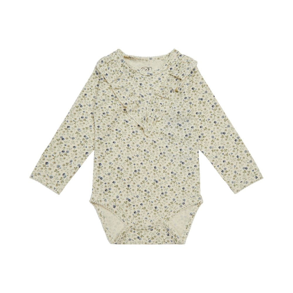 Yndig langærmet body fra Petit by Sofie Schnoor i en blød og strækbar bomuldskvalitet.Bodyen er i creme farve med blomster og har en flot flæse foran på brystet. Den har en smal ribkant med en lille blonde i alle åbninger og lukkes med trykknapper på venstre skulder og imellem ben.