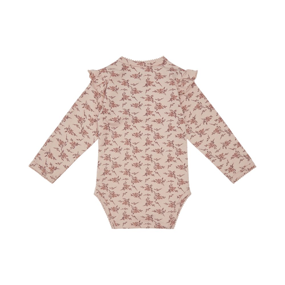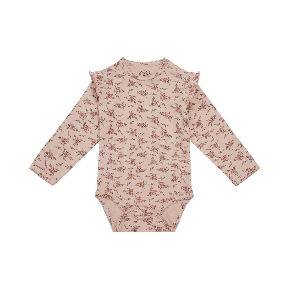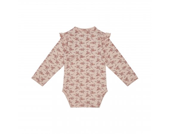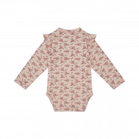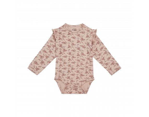 Yndig langærmet body fra Petit by Sofie Schnoor i en blød og strækbar bomuldskvalitet.Bodyen er i rosa farve med blomster-grene og flotte flæser på skuldre. Den har en smal ribkant med en lille blonde i alle åbninger og lukkes med trykknapper på venstre skulder og imellem ben.