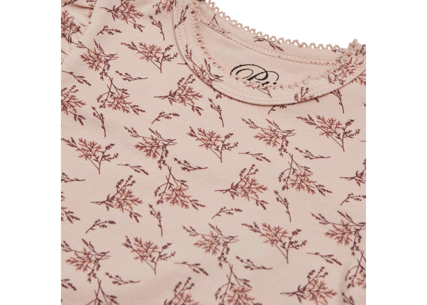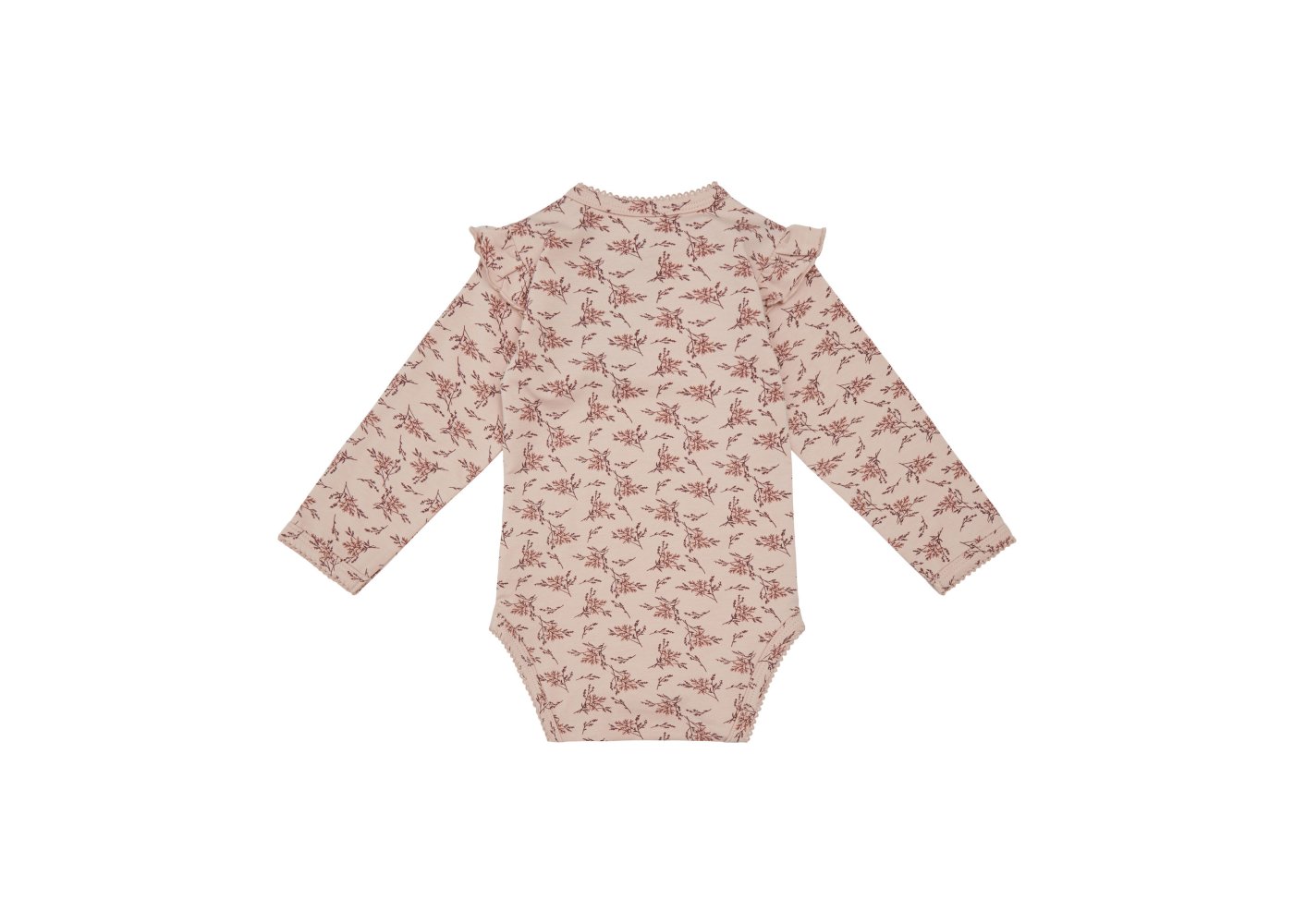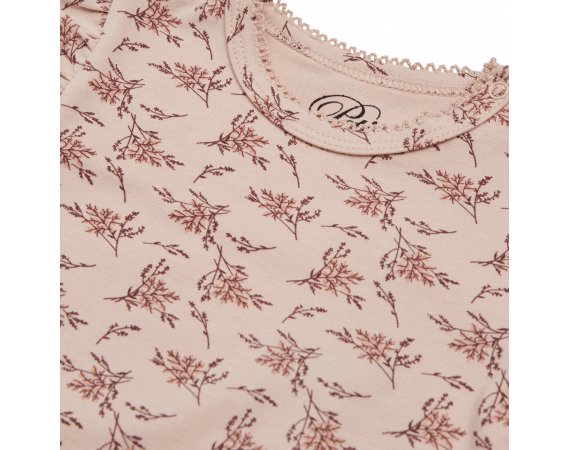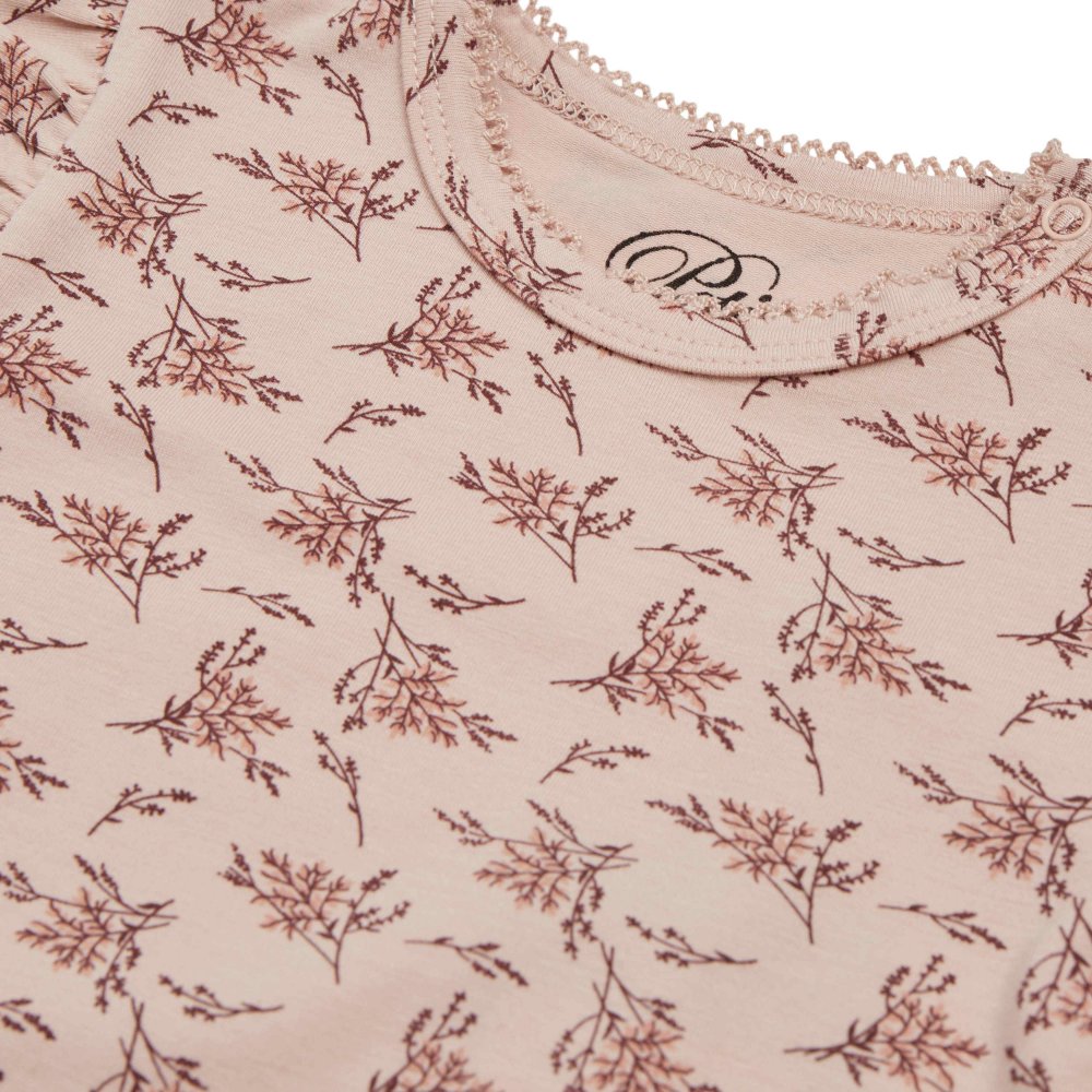 Yndig langærmet body fra Petit by Sofie Schnoor i en blød og strækbar bomuldskvalitet.Bodyen er i rosa farve med blomster-grene og flotte flæser på skuldre. Den har en smal ribkant med en lille blonde i alle åbninger og lukkes med trykknapper på venstre skulder og imellem ben.