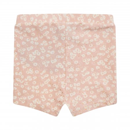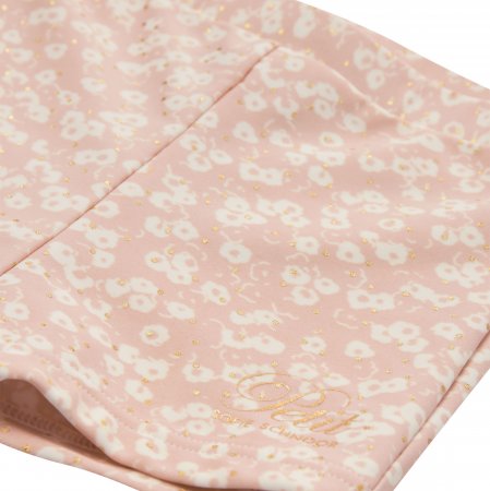 Smarte badebukser i rosa farve med lyse blomster og små guld prikker fra Petit by Sofie Schnoor.Badeshortsene har elastik i livet og er fremstillet af et strækbart polyester materiale.