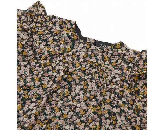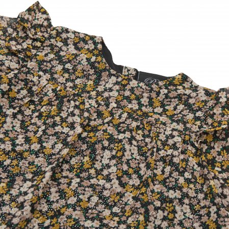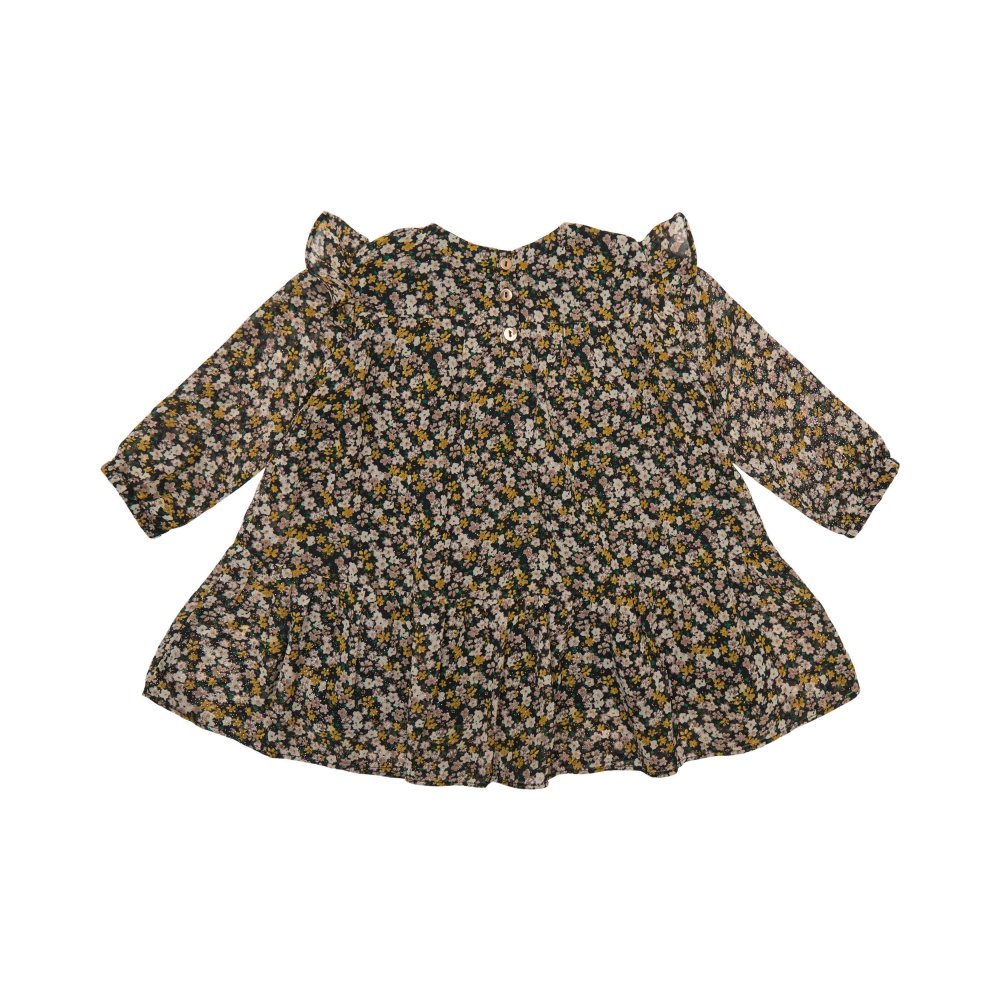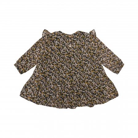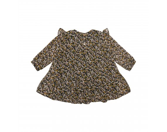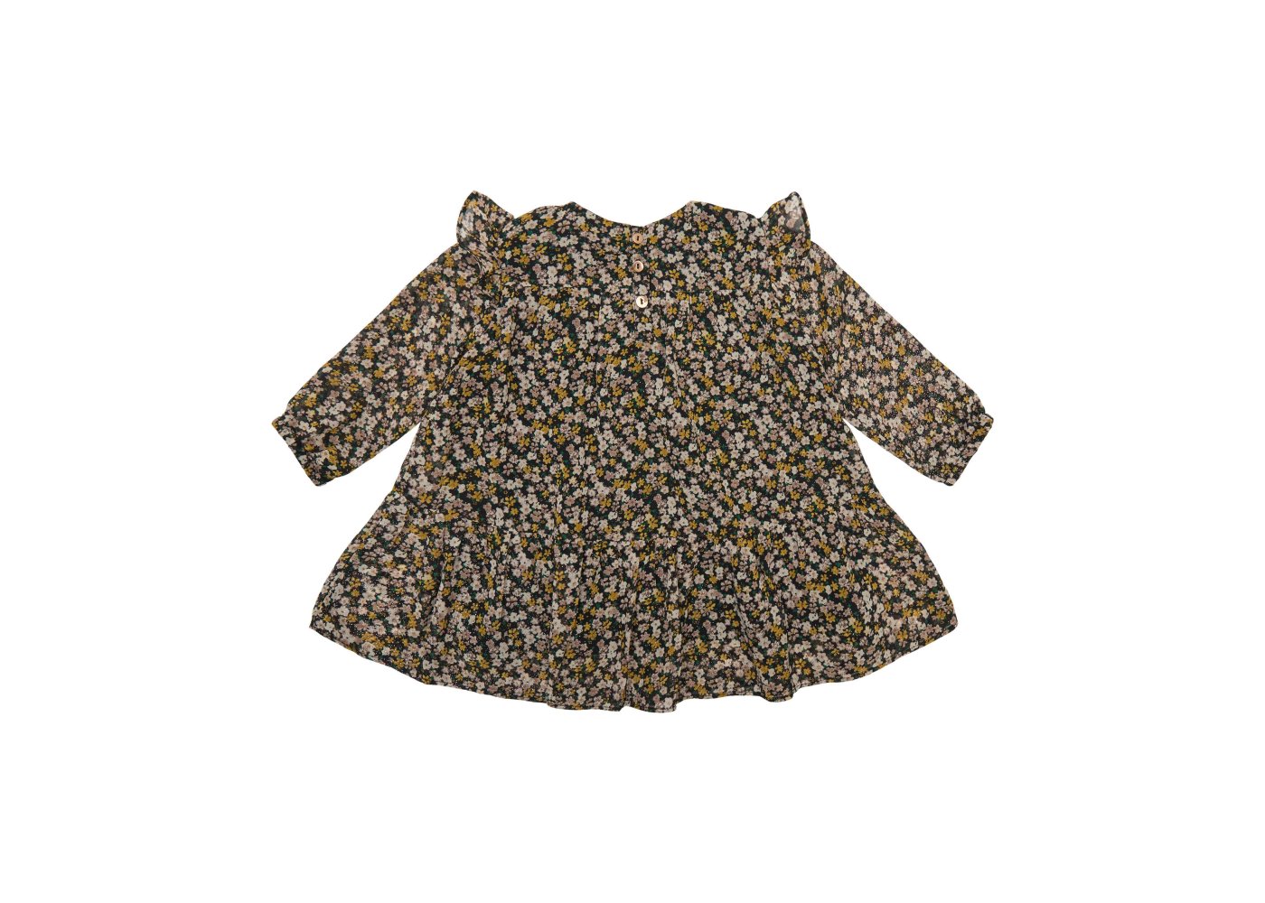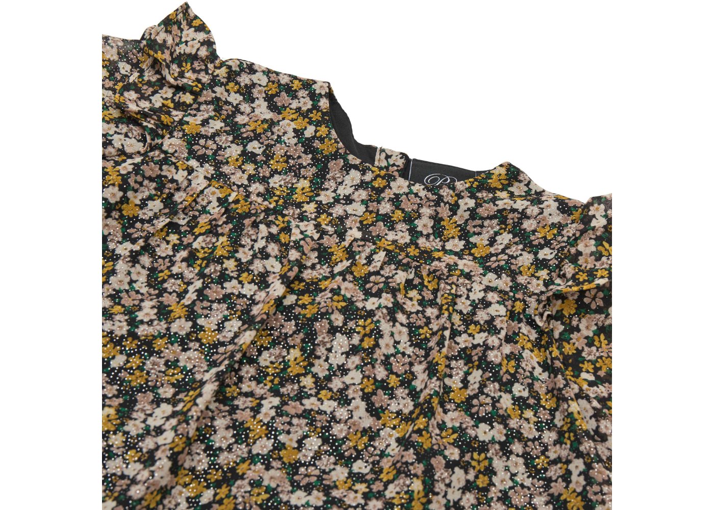 Skøn sort langærmet kjole med blomster og små prikker i sølv fra Petit by Sofie Schnoor.Kjolen har flotte flæser på skuldre og en flæsekant nederst på kjolen, der giver flot fylde. Den har elastik ved håndled og lukkes med knapper bagpå. Kjolen har bomuldsskørt, så den er ikke gennemsigtig.