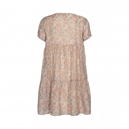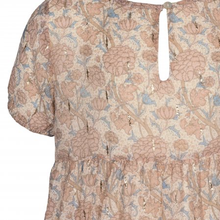 Yndig og romantisk kjole med flot blomster mønster i rosa, blå og beige nuancer og med små fine guld streger.