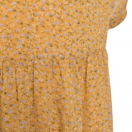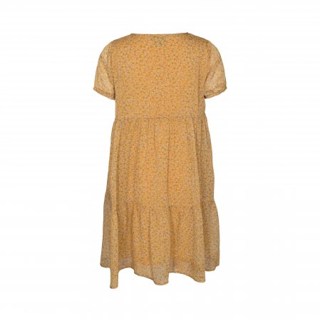 Yndig gul kjole med flot blomster mønster i blå og lyse nuancer.