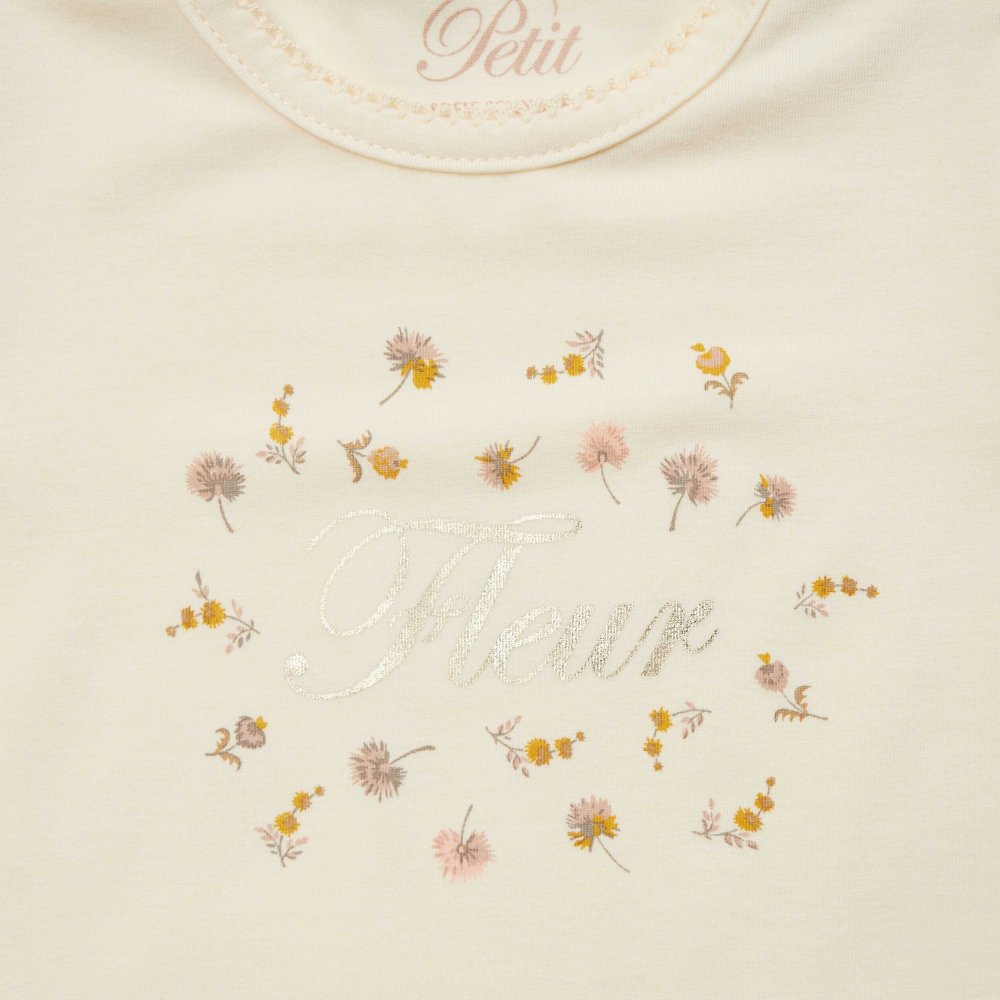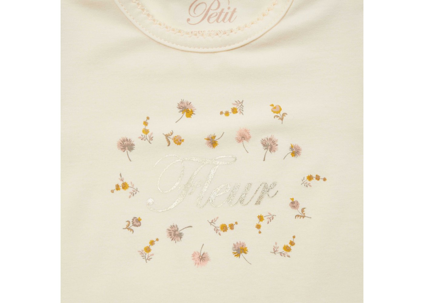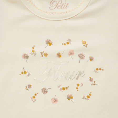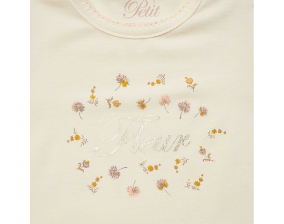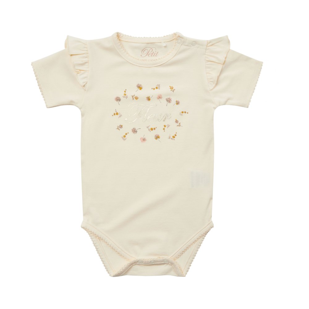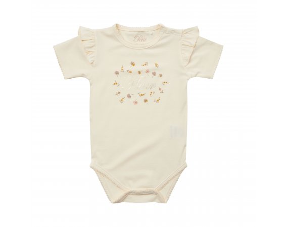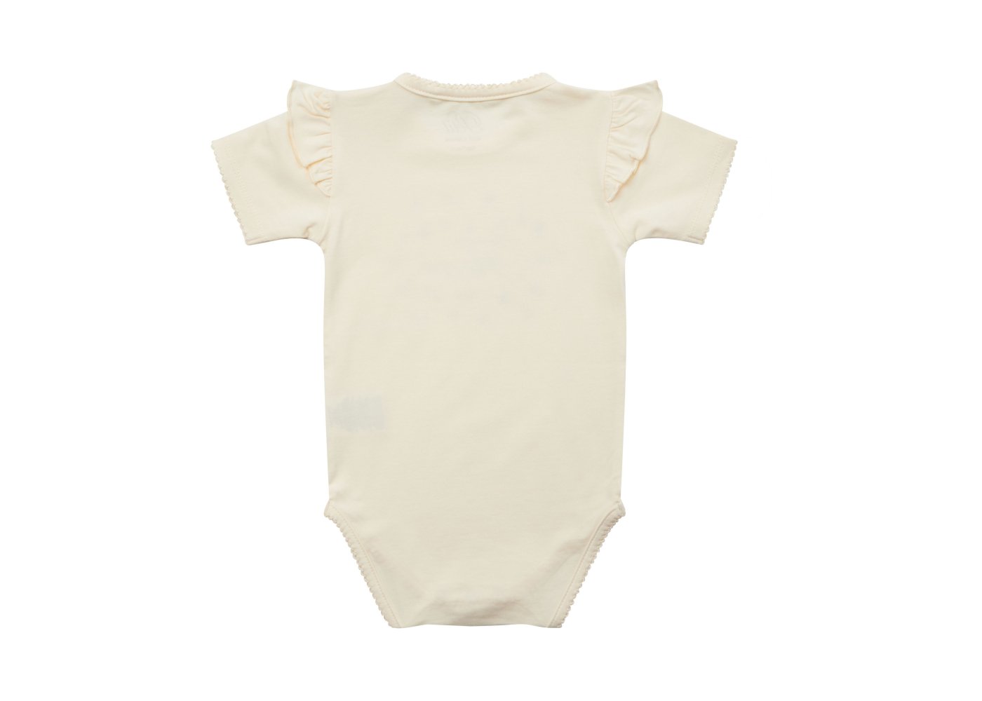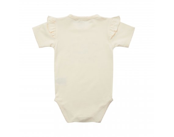 Yndig kortærmet body i off white farve med tekst og mælkebøtter foran.Bodyen har fine flæser på skuldre og lukkes med trykknapper på venstre skulder og imellem ben.