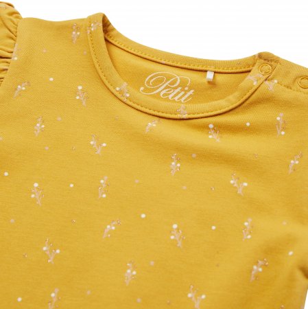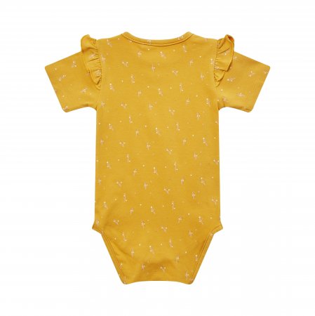 Yndig kortærmet body i sennepsgul farve med mønster af grene, der ved at springe ud.