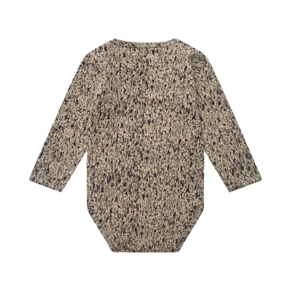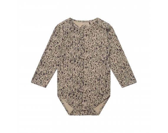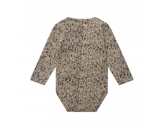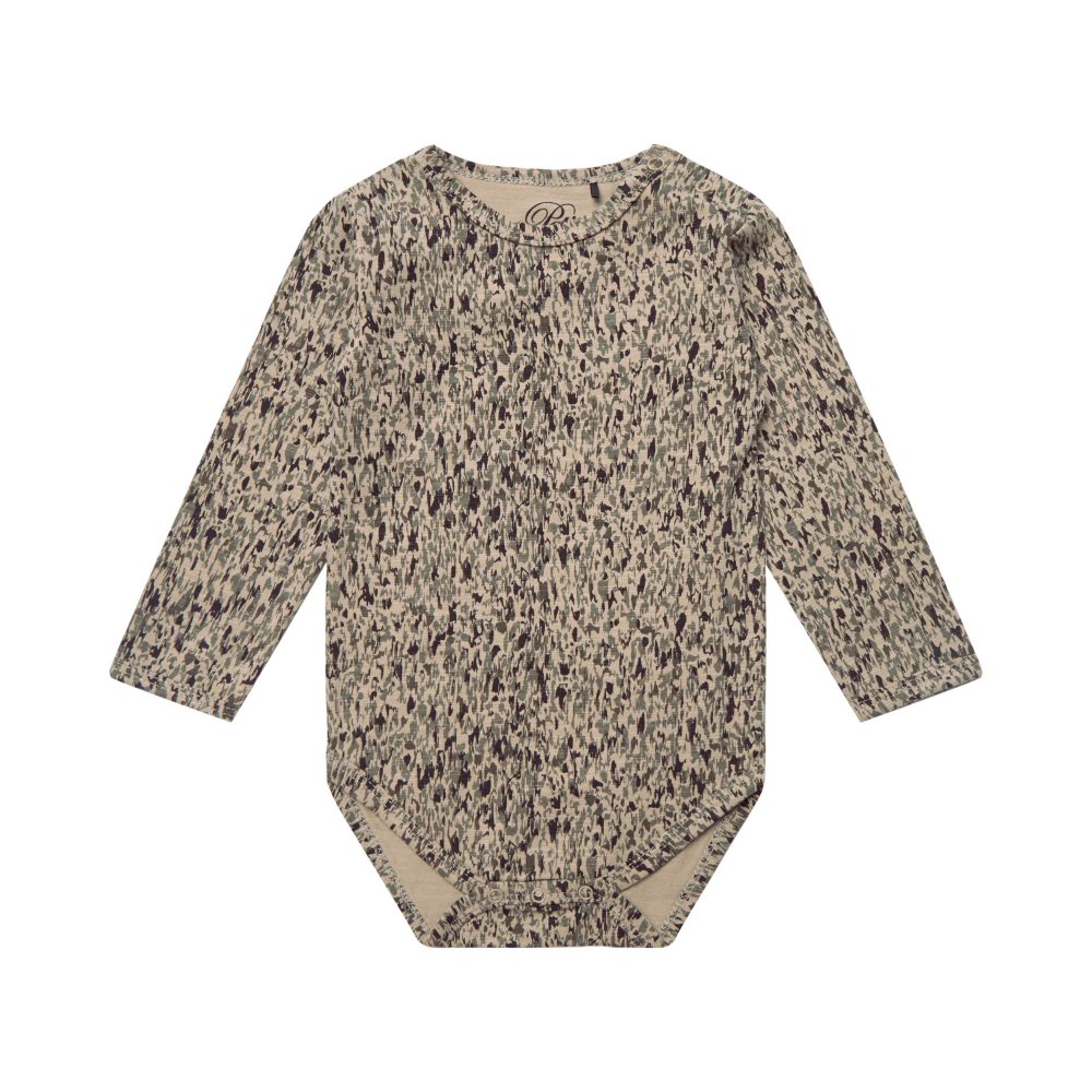 Bodyen har lange ærmer og lukkes med trykknapper på venstre skulder.