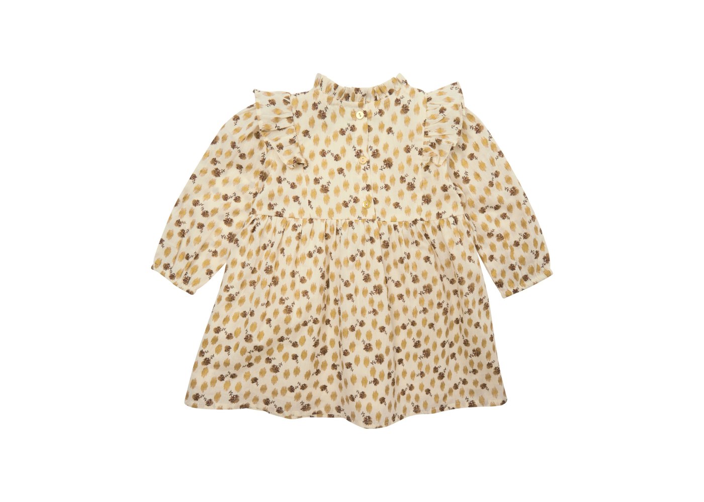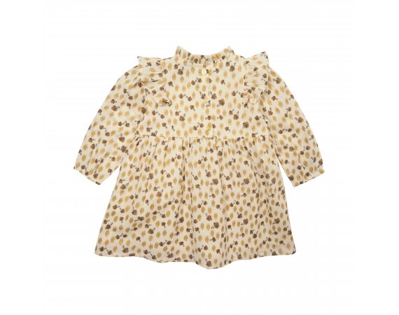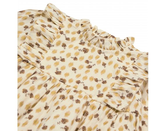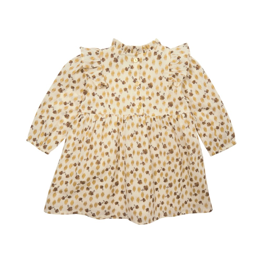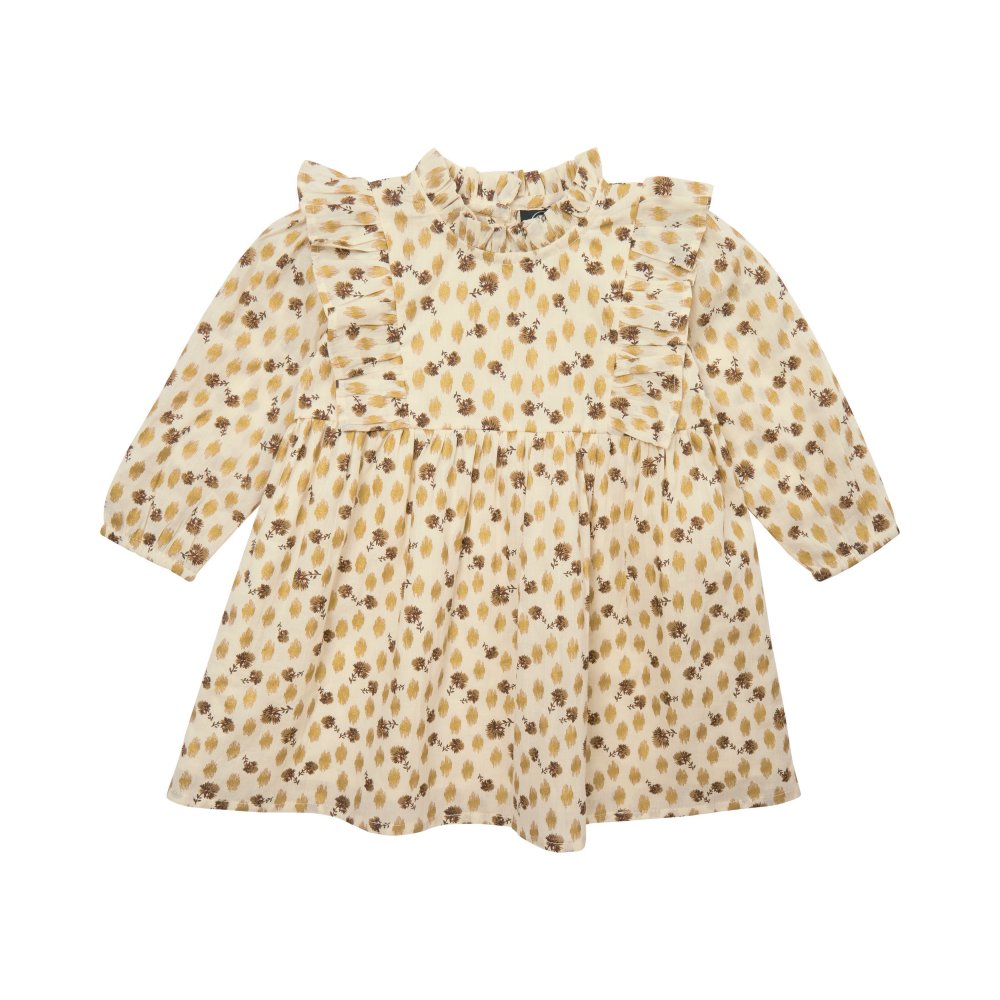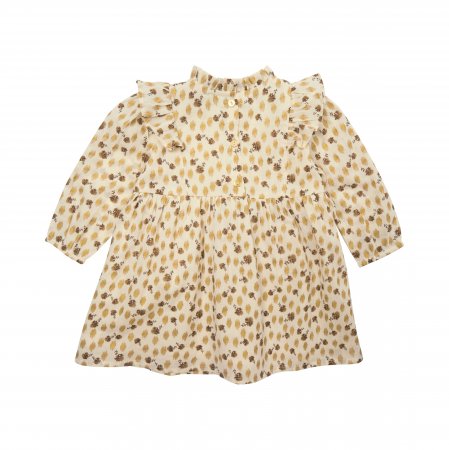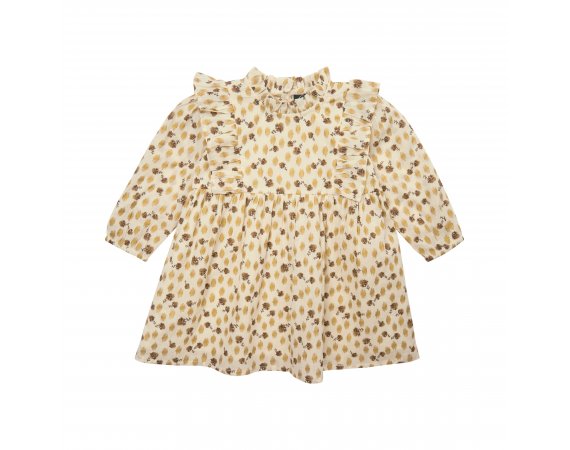 Kjolen har en rund halsudskæring med yndig flæsekant, og et fint bærestykke med flæser både foran og bagpå. Den har et fin rynket skørt med vidde og rynkedetaljer og en fin lille elastikkant ved håndled. Kjolen lukkes med knapper bagpå.