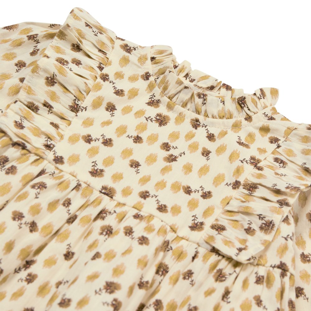 Yndig langærmet antik hvid kjole med blomster i beige og brun fra Petit by Sofie Schnoor.