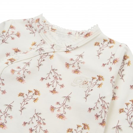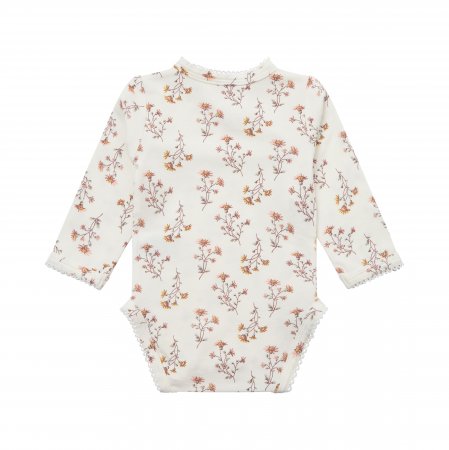 Bodyen har print med blomstergrene i brun og beige, og har fine smalle ribkanter med blonde i alle åbninger. Den lukkes foran og imellem ben med trykknapper.