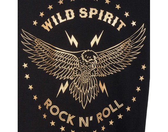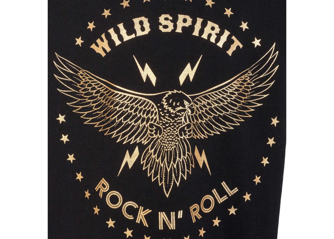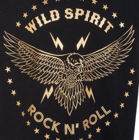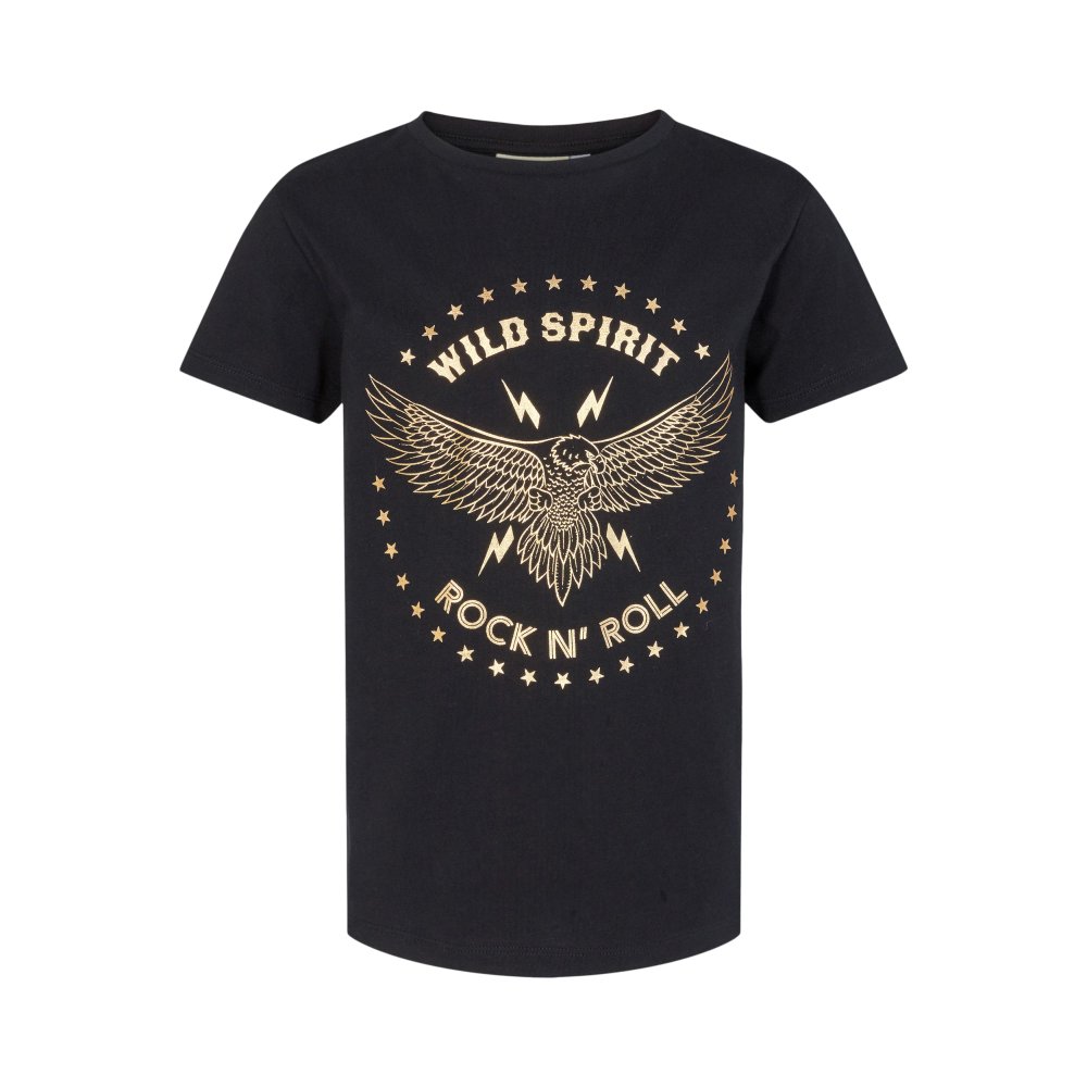 Kortærmet sort t-shirt med flot guldprint med stjerner, tekst og ørnemotiv.