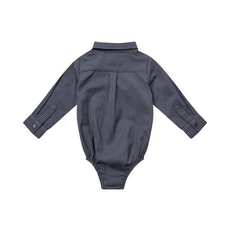 Bodyen er blåstribet, har fin skjorteflip, og åbnes med gennemgående knapper foran og ved håndled. Skjortebodyen har elastikkanter ved ben og trykknapper.