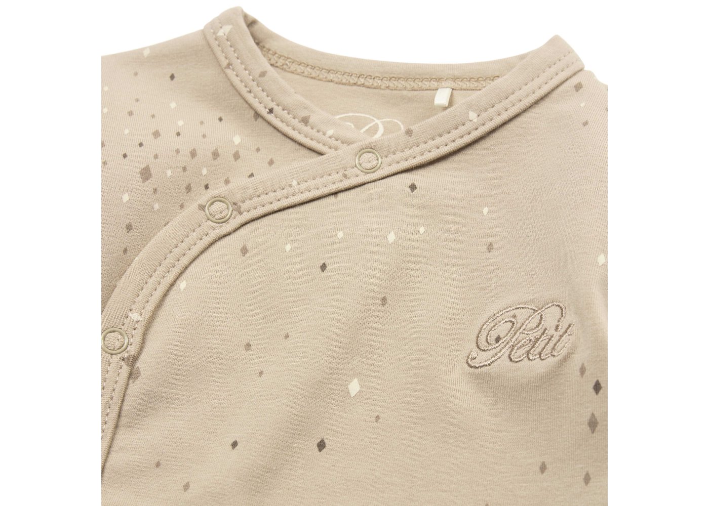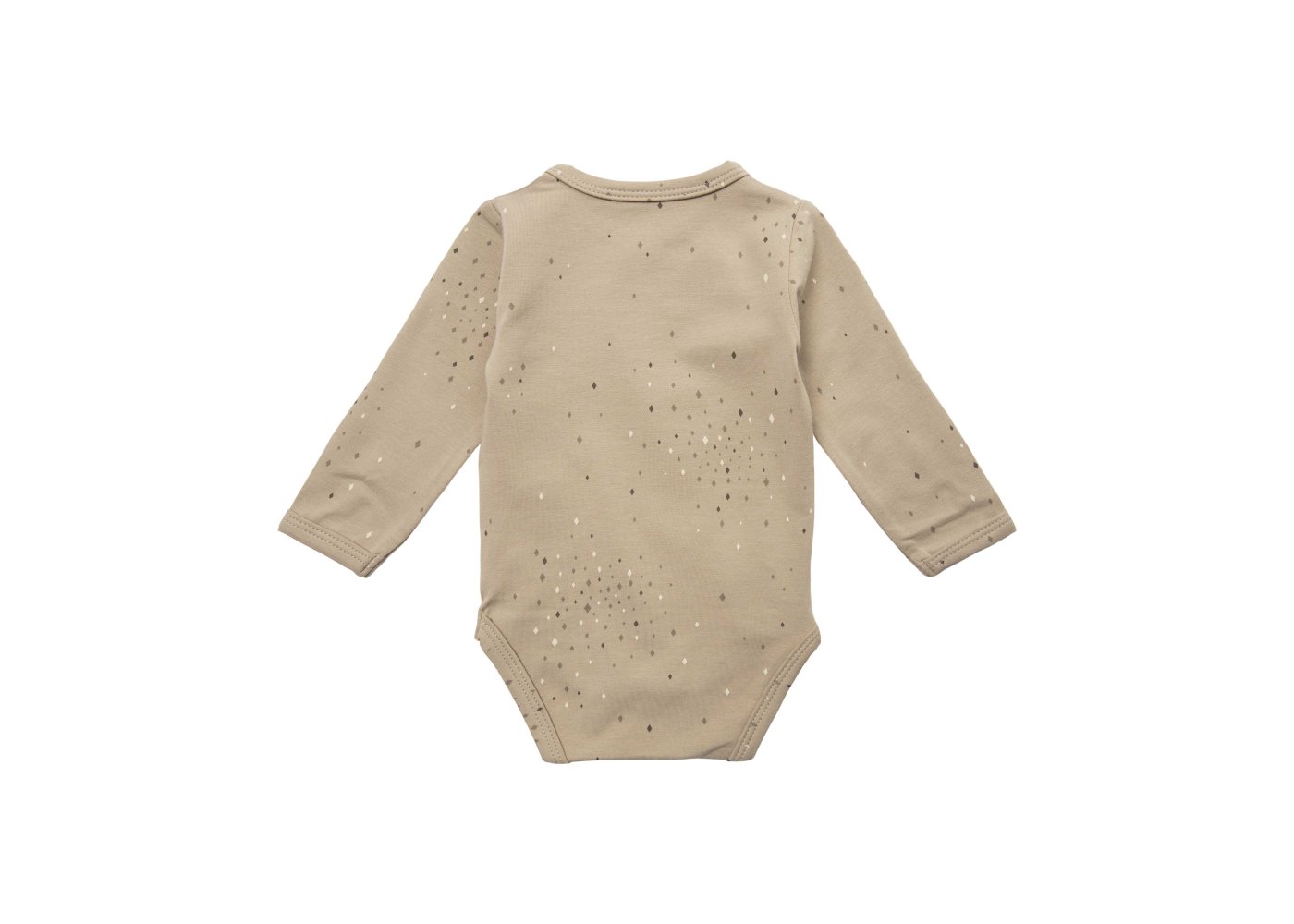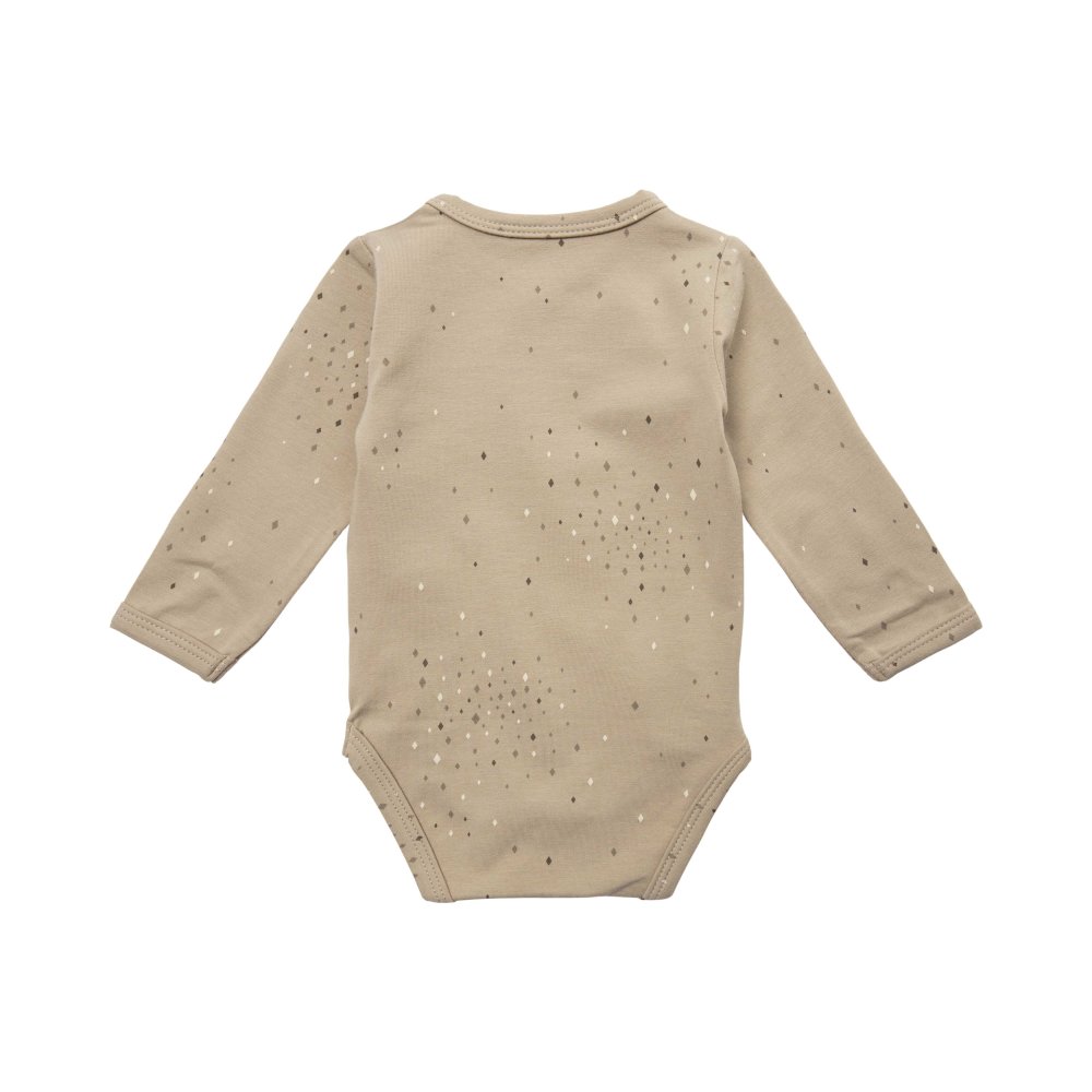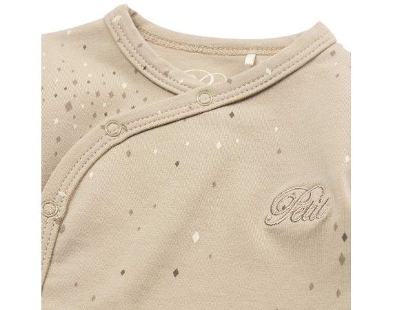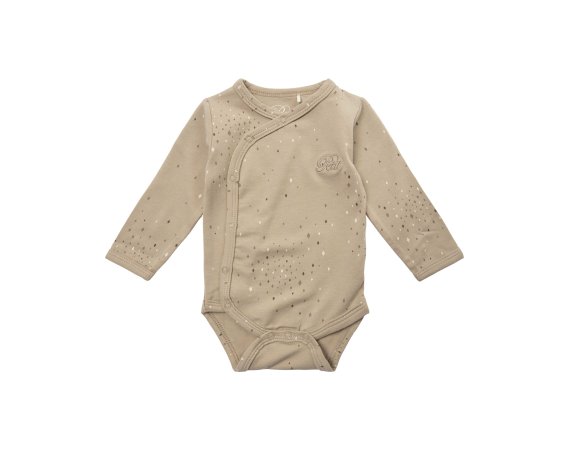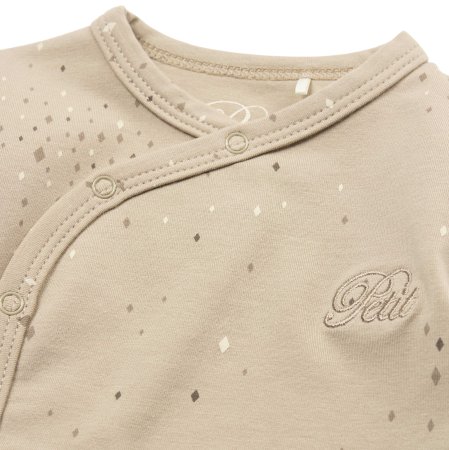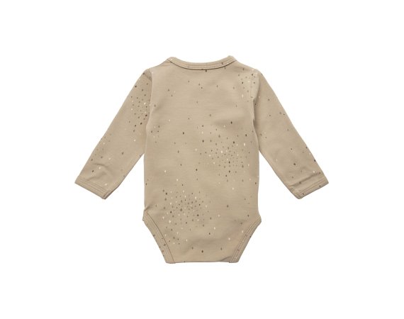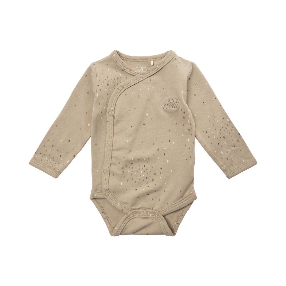 Sød sandfarvet body med lange ærmer fra Petit by Sofie Schnoor.Bodyen har fine smalle ribkanter i alle åbninger. Den lukkes foran og imellem ben med trykknapper.