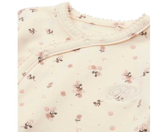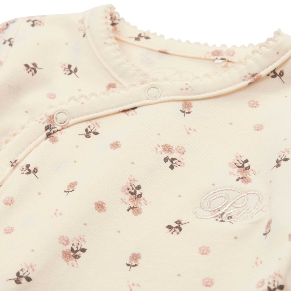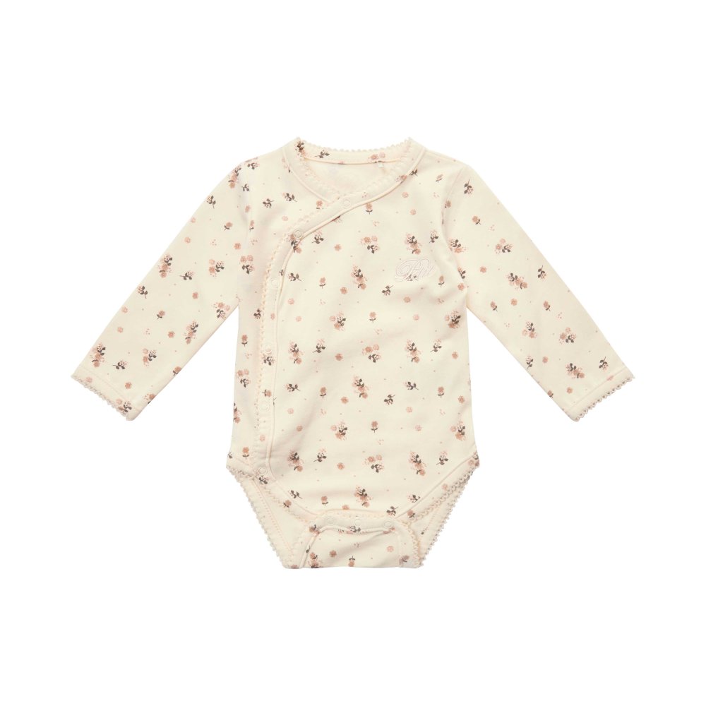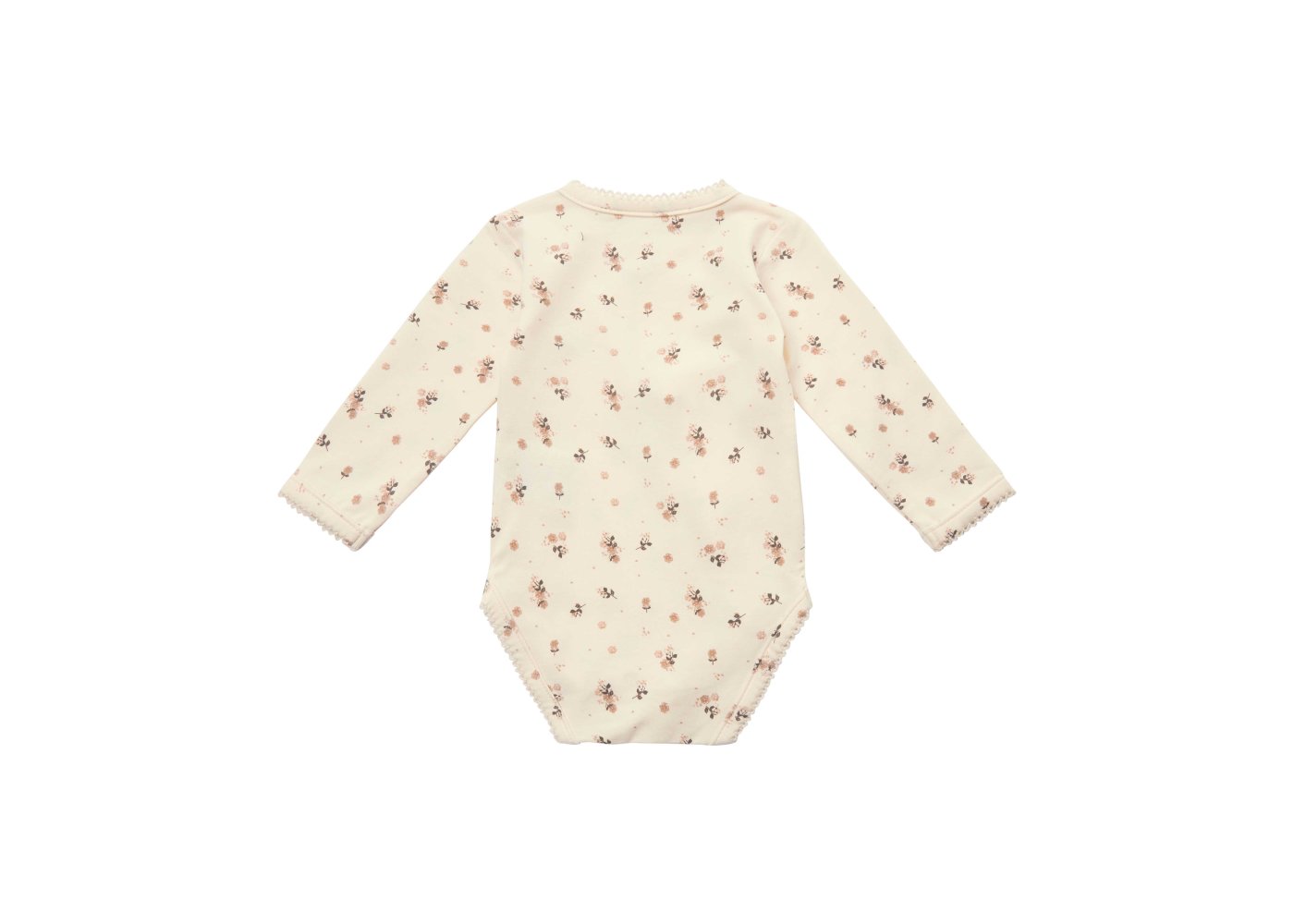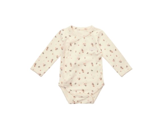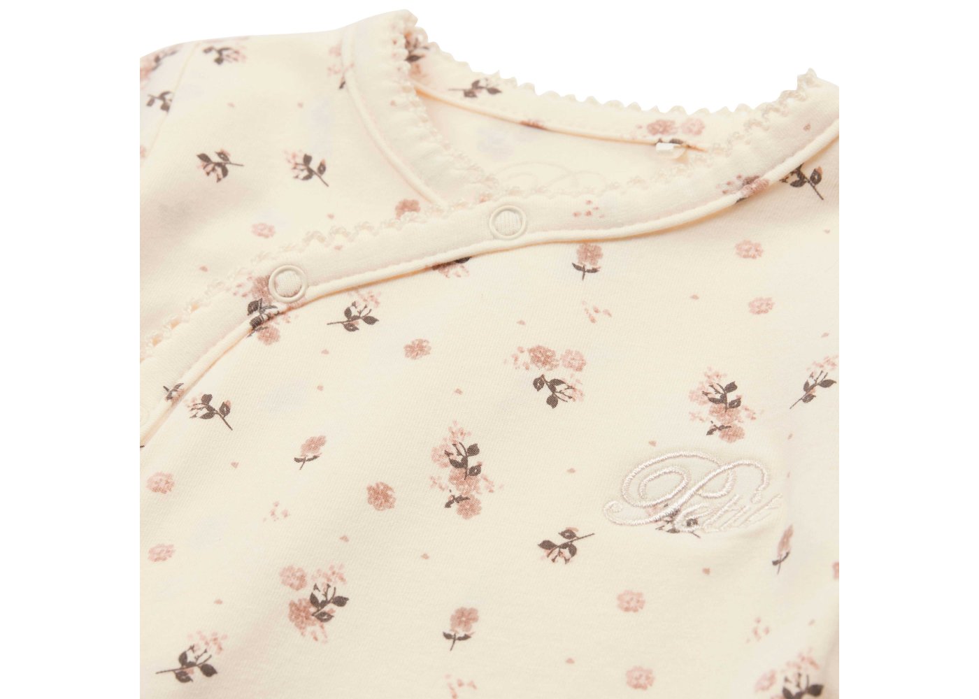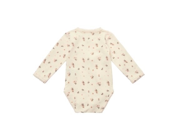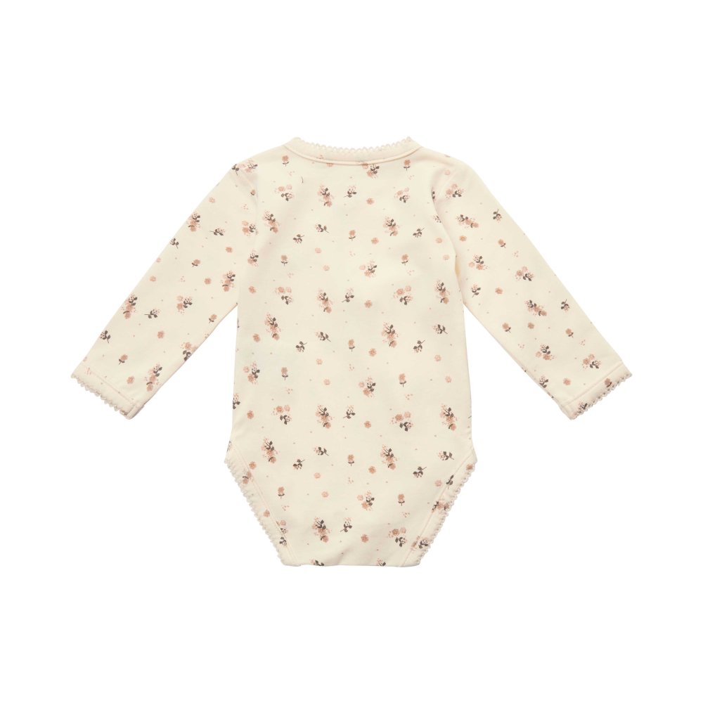 Sød antik hvid body med blomster og lange ærmer fra Petit by Sofie Schnoor.Bodyen har fine smalle ribkanter i alle åbninger. Den lukkes foran og imellem ben med trykknapper.